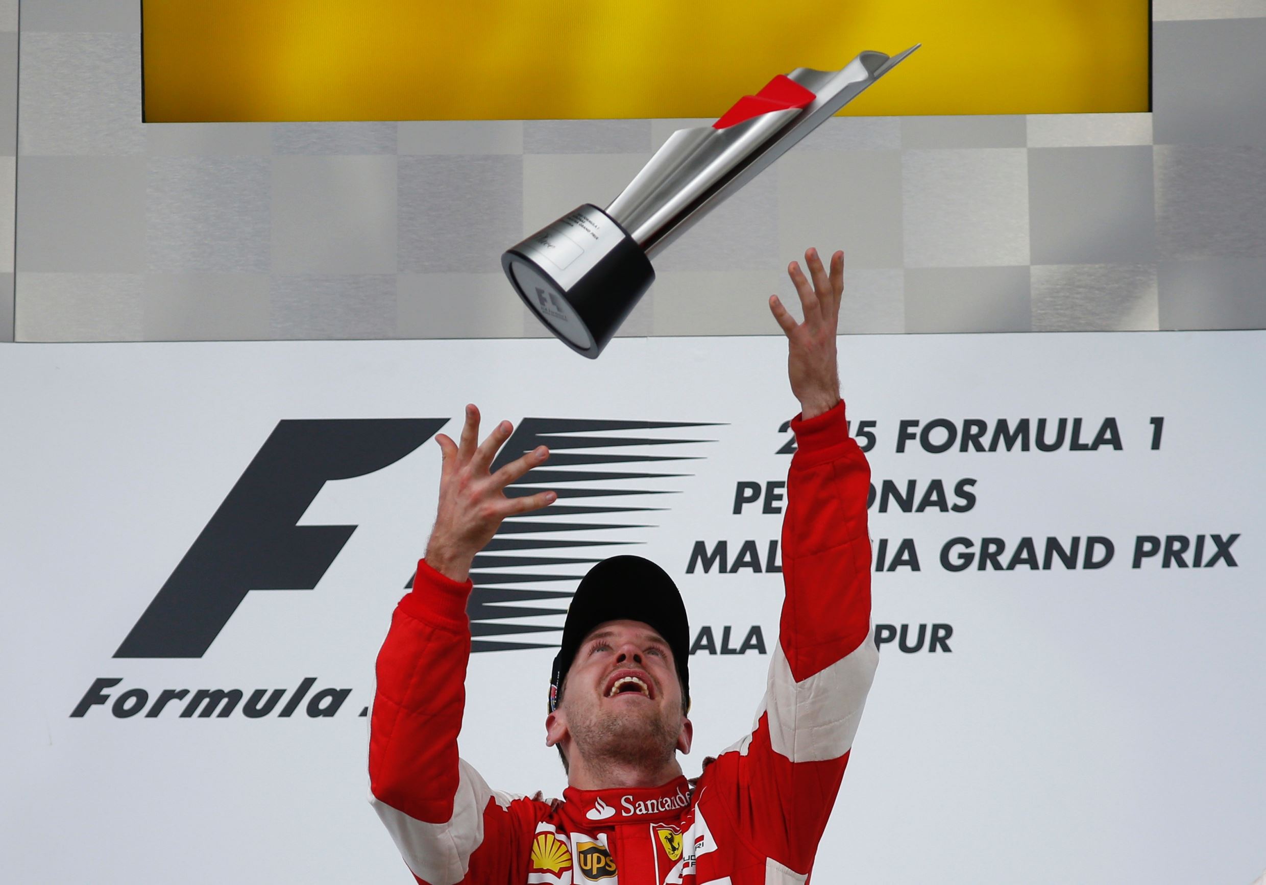 A triumphant Vettel launches his trophy into the air