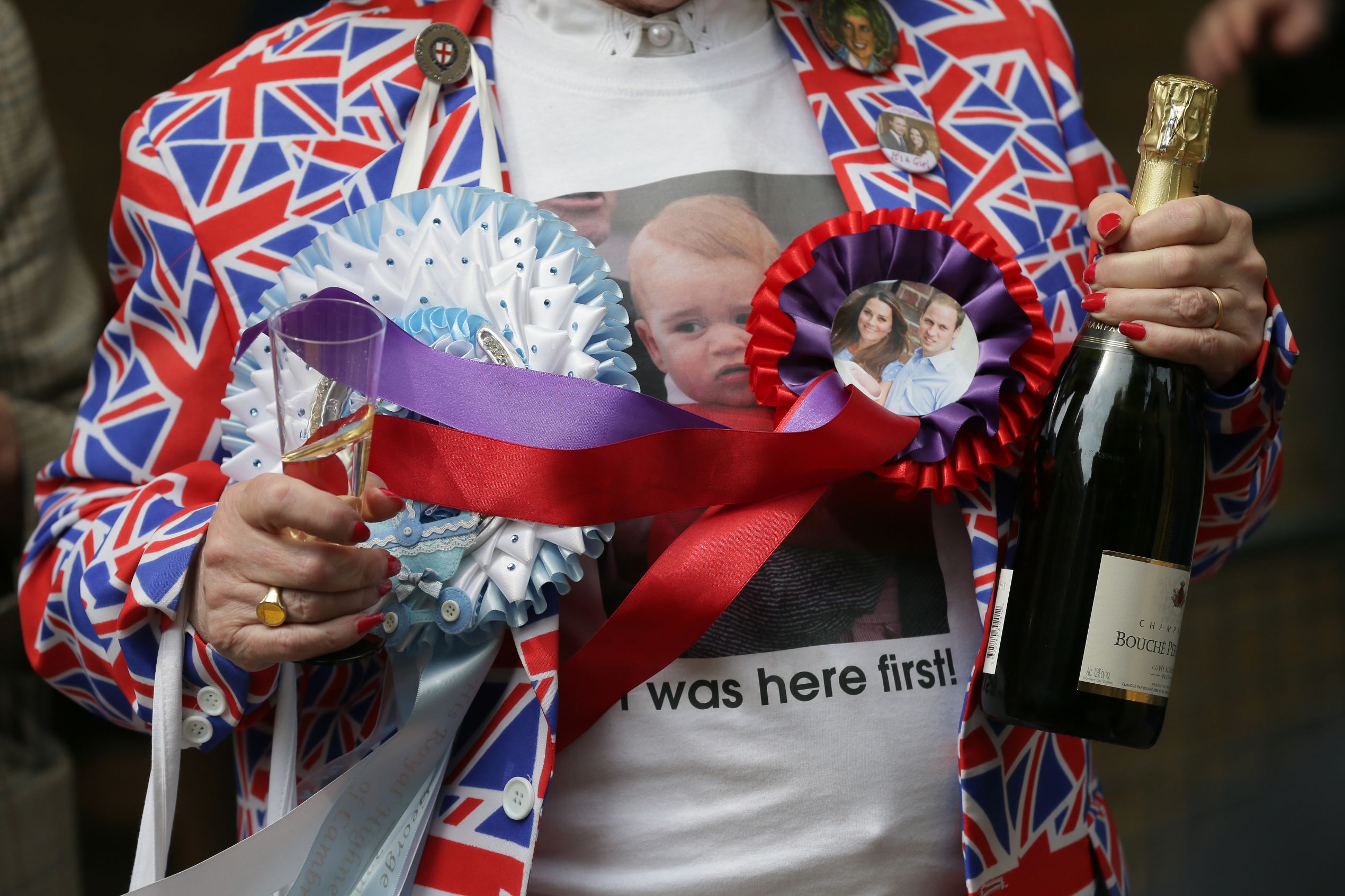 A royal fan with a champagne in her hand and a photo of prince George on her t-shirt celebrates the birth of the royal baby.