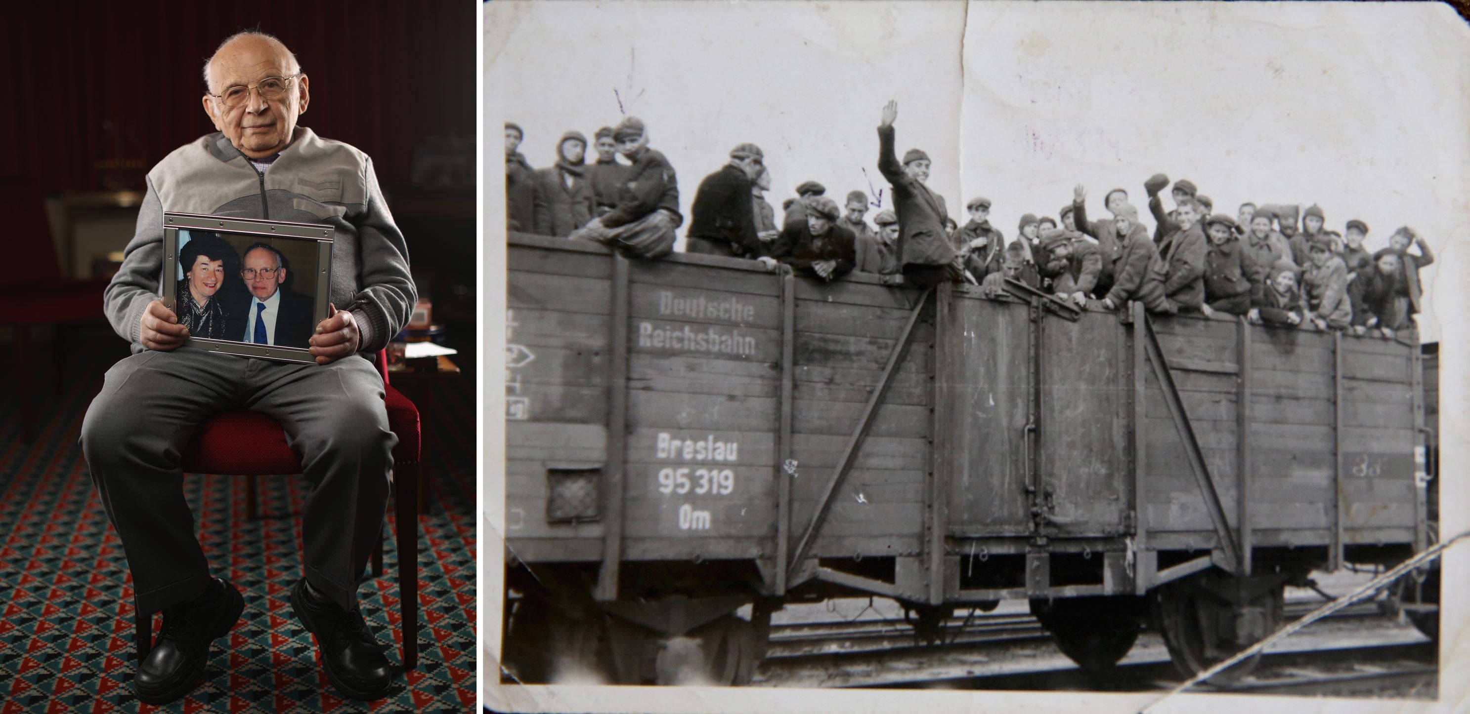 As a child, Riseman and his family were sent to Auschwitz from their home in Poland, and were eventually liberated by the Russian forces. Right, A photograph of Riseman (third on the left) on a train, two days before the end of the war.