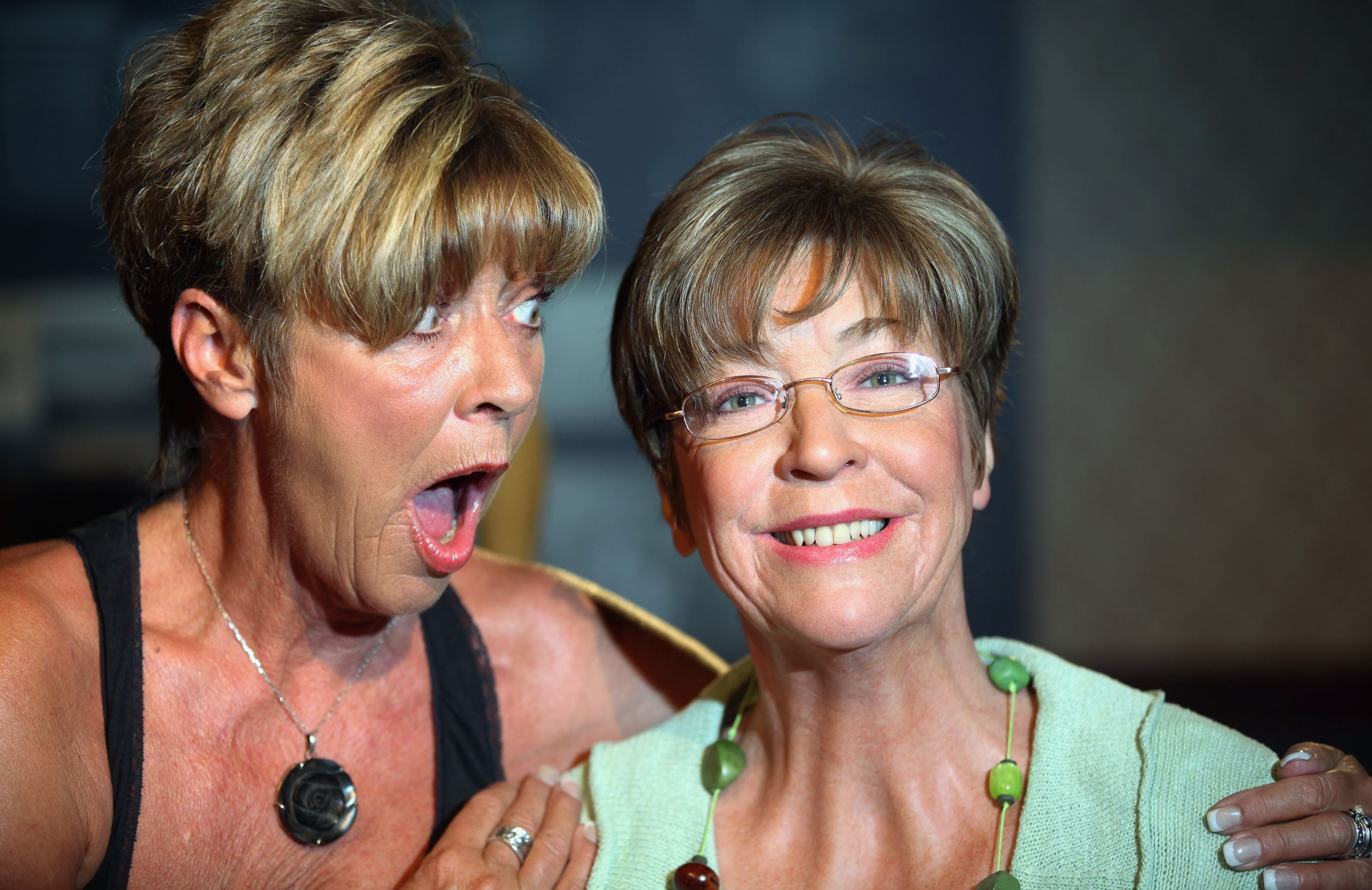 Coronation Street actress Anne Kirkbride comes face to face with a wax work model of her street character Deirdre Barlow on July 25, 2011 in Blackpool, England.