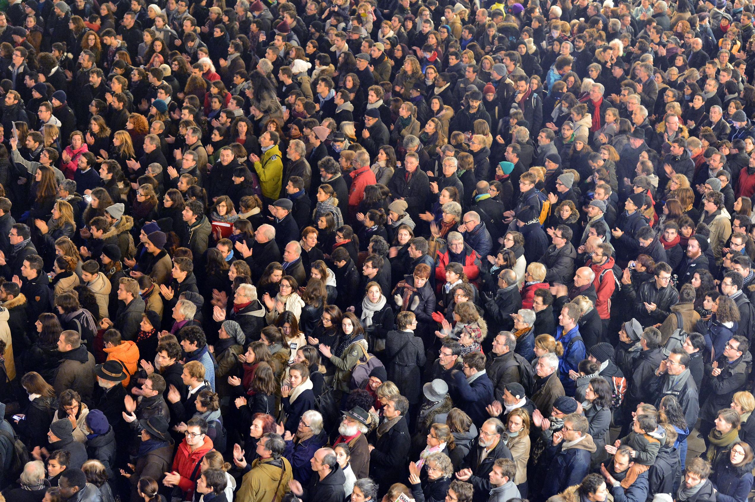 People gather at the Place Royale in Nantes, France, on January 7, 2015, to show their solidarity for the victims of the attack.