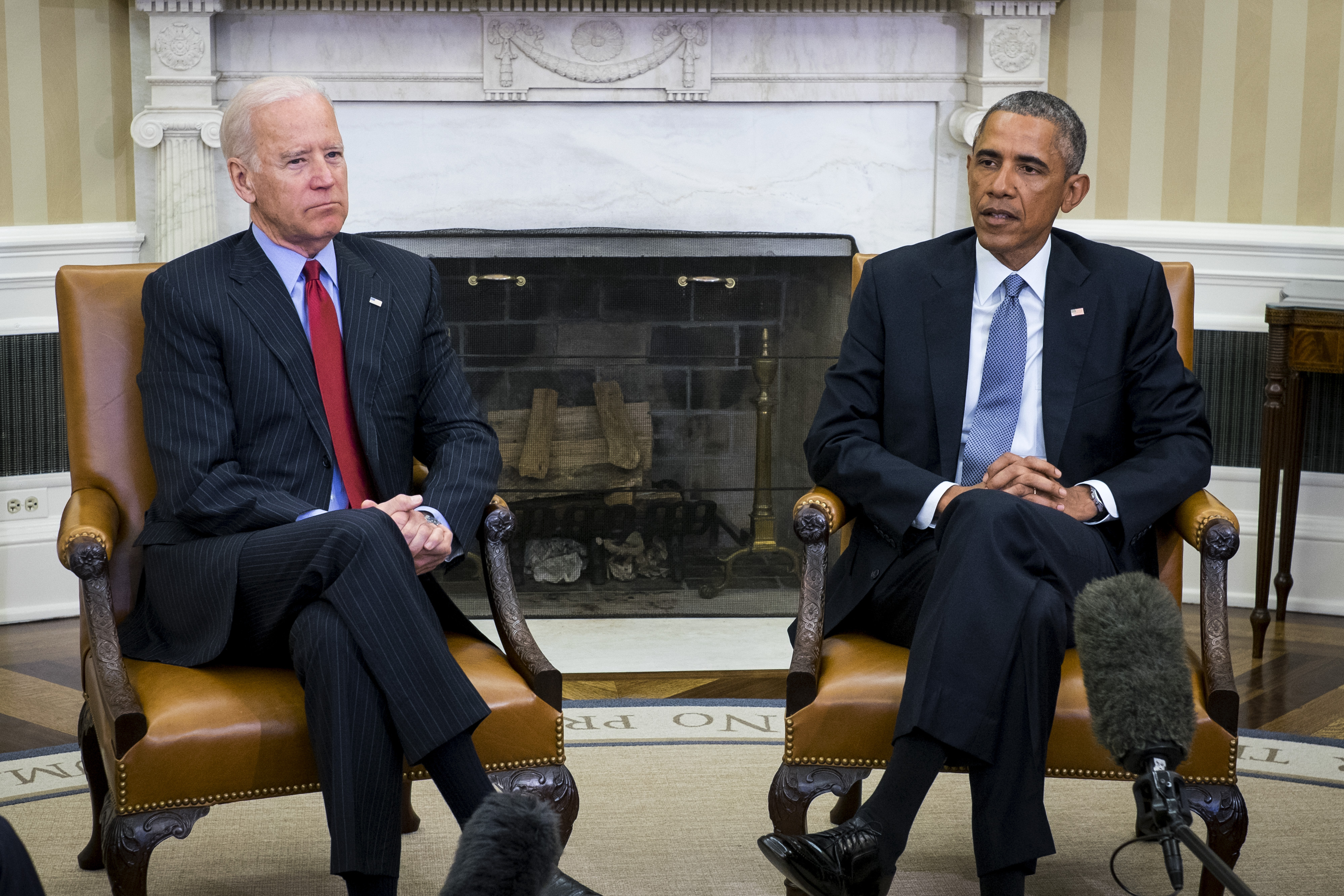 U.S. President Barack Obama (R) listens to a question from a reporter with Vice President Joe Biden in the Oval Office of the White House. Obama promised to give France the full assistance of the U.S. in hunting down the gunmen who attacked the Paris office of the magazine.