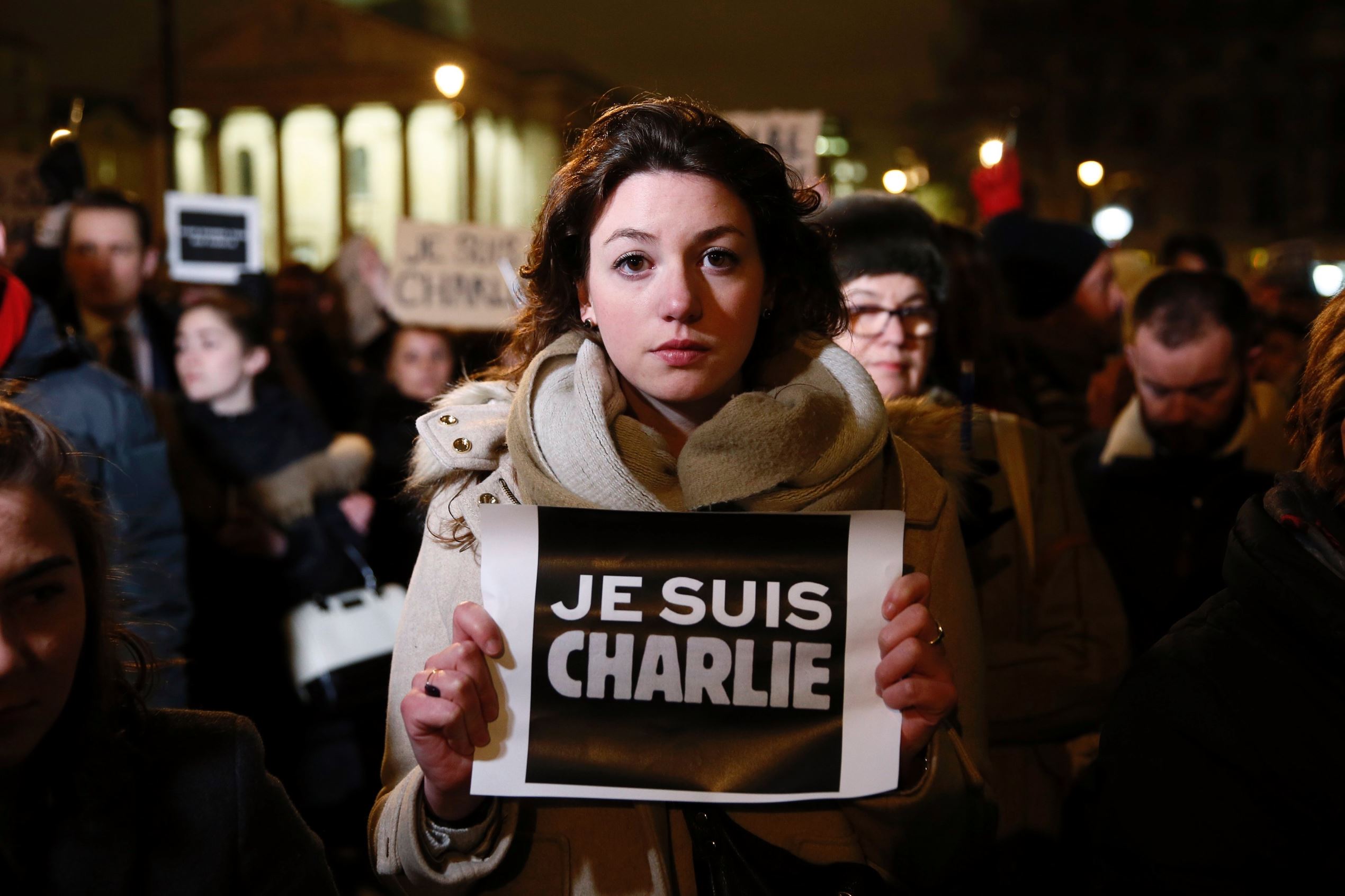 woman holds a placard that reads "I am Charlie" during a vigil to pay