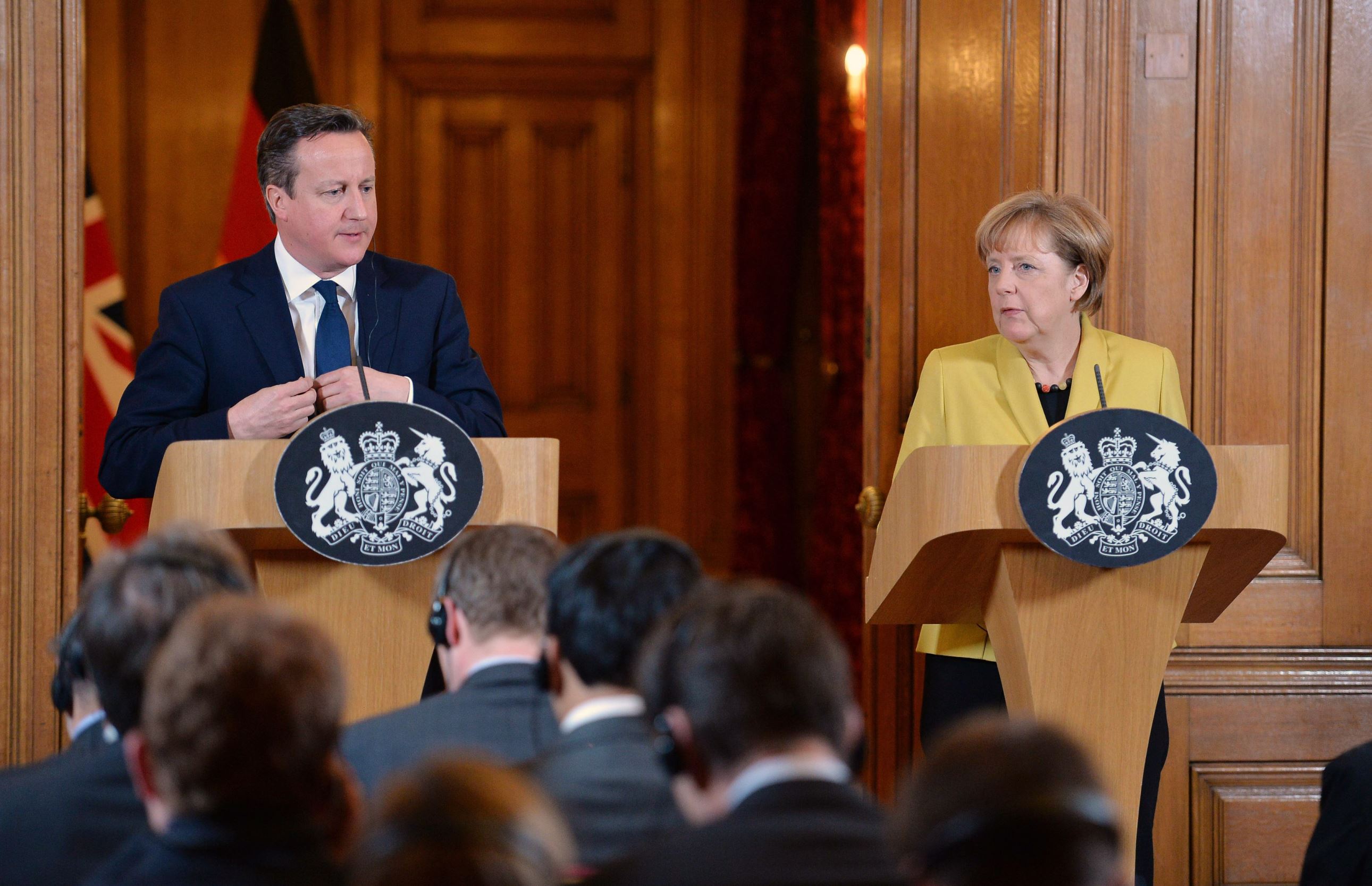 Chancellor Angela Merkel (R) speaks during a joint news conference with British