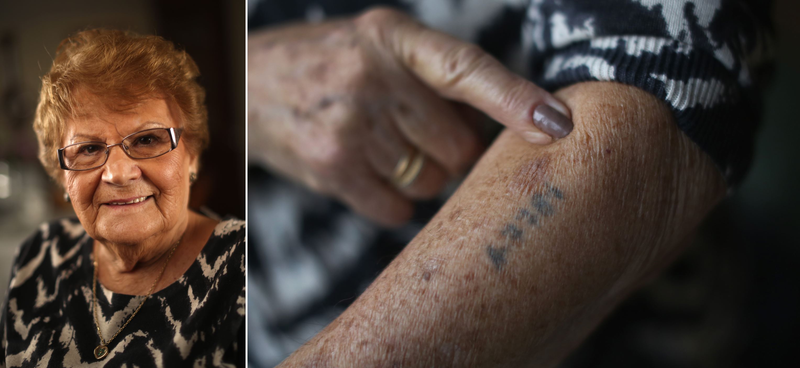 As the Russians approached Poland the Nazis saw the end of the war coming and on January 1, 1945, Eva was sent from Auschwitz to Bergen, where she was eventually liberated by the British. Right, Eva Behar shows her camp number tattoo.