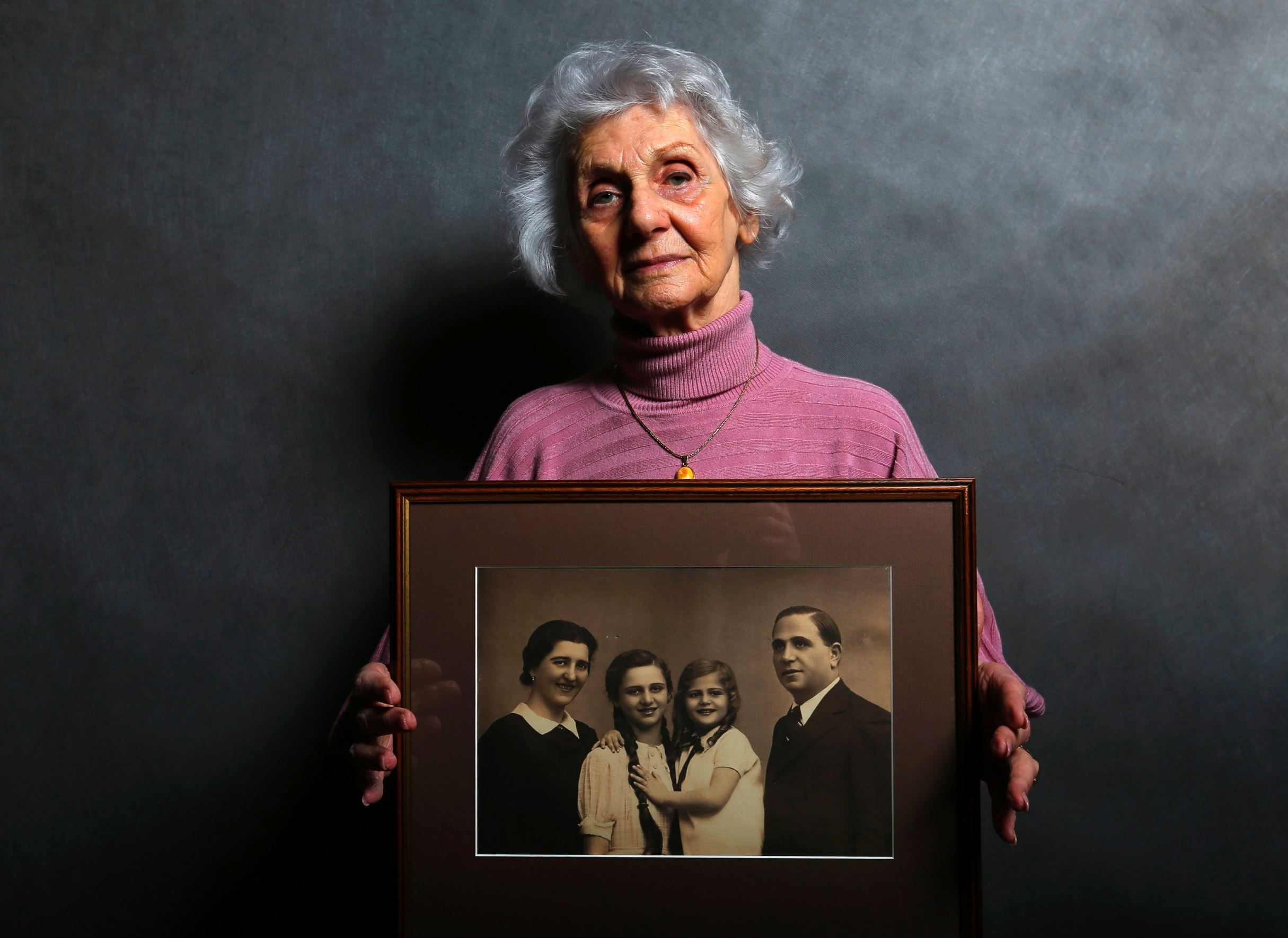 Eva Fahidi, 90, holds a picture of her family, who were all killed in the concentration camp, as she poses for a portrait in Budapest on January 12, 2015.