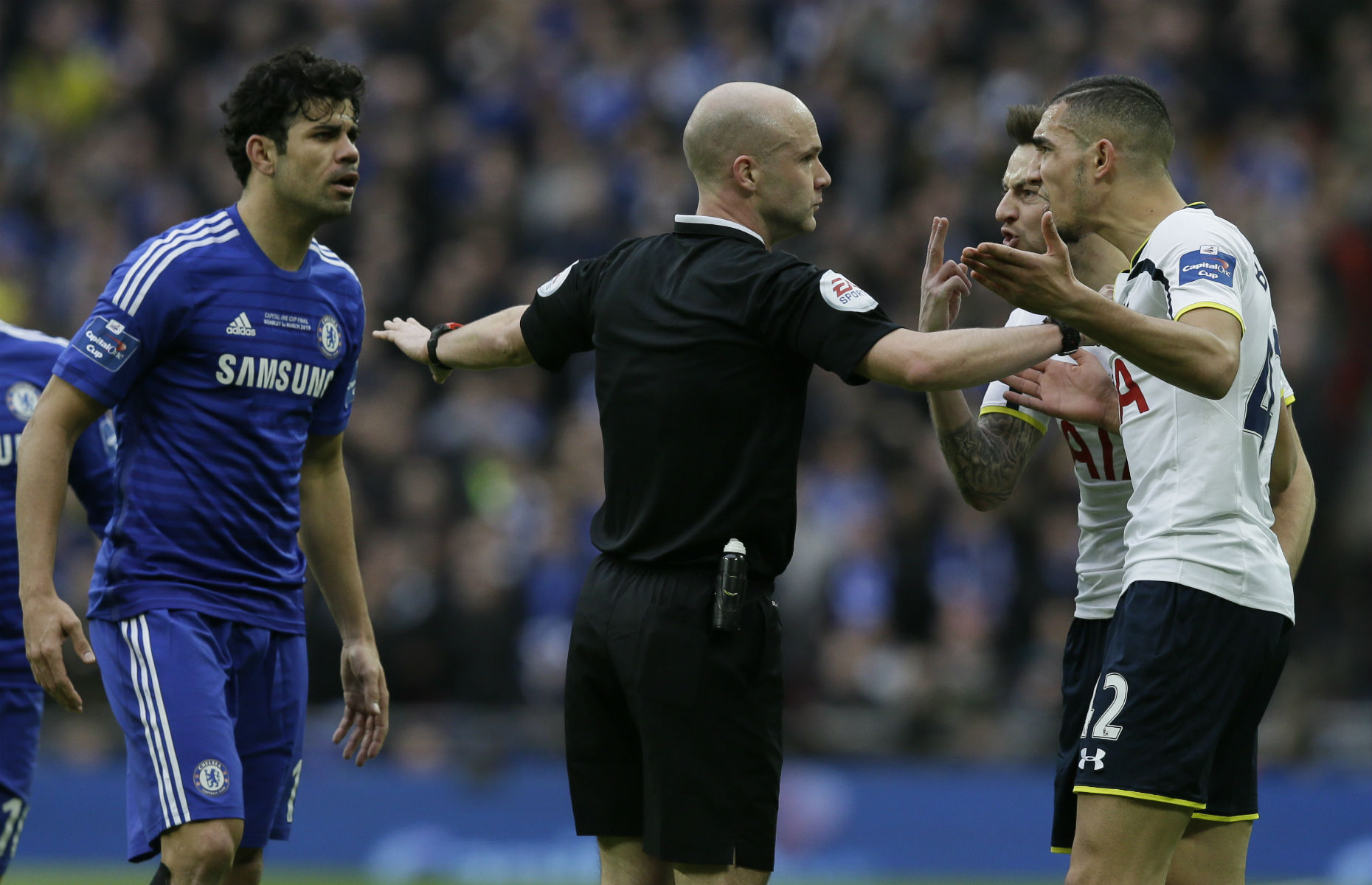 Referee Anthony Taylor separates Diego Costa and Nabil Bentaleb