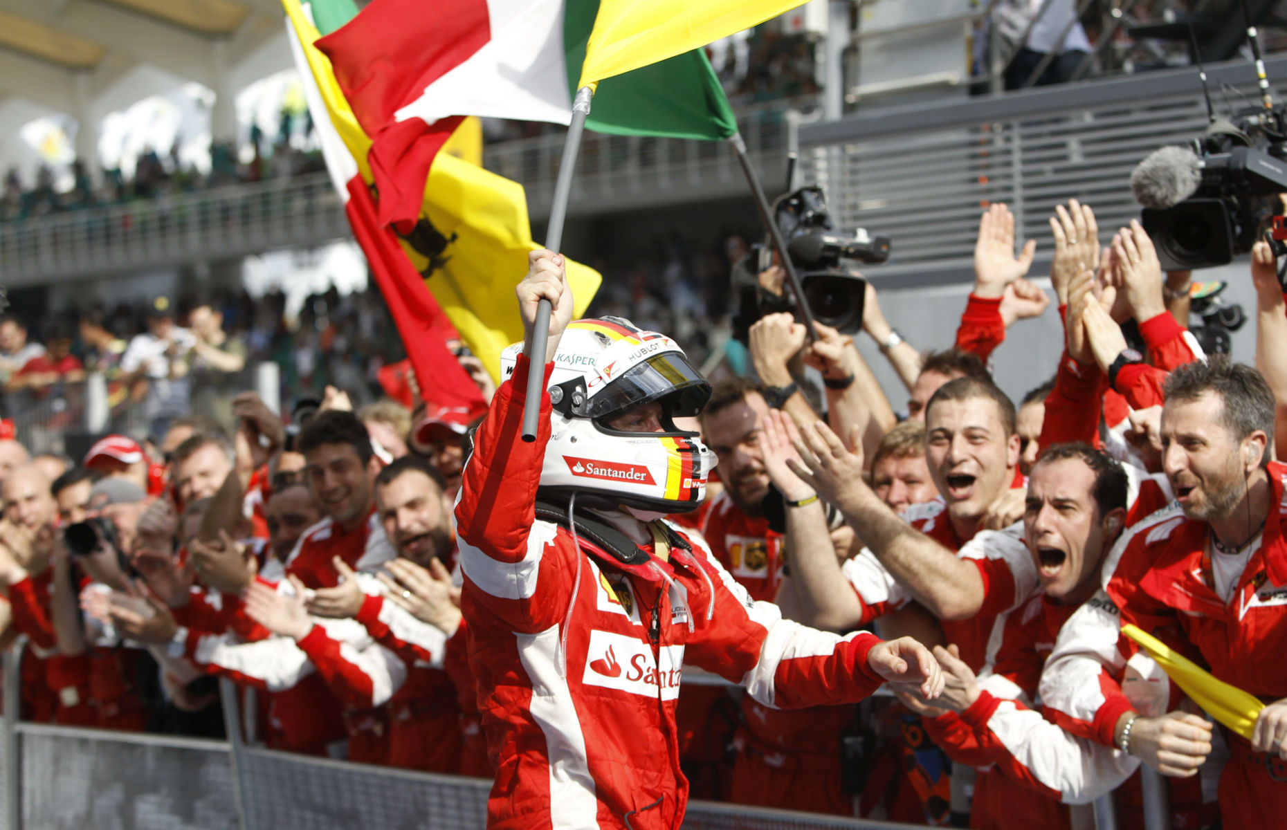 Sebastian Vettel of Ferrari celebrates his victory in Malaysia