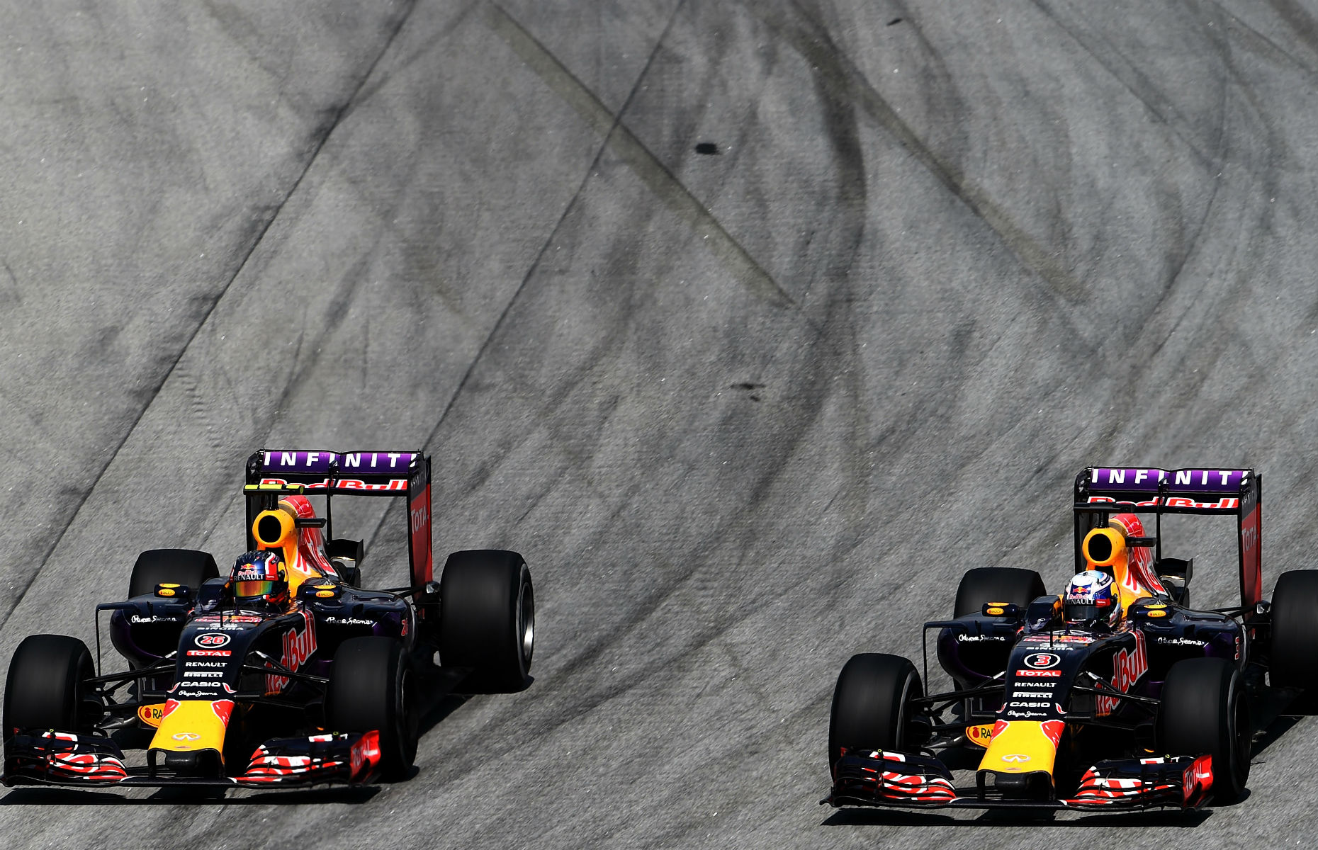 Daniel Ricciardo of Australia and Infiniti Red Bull Racing drives next to Daniil Kvyat