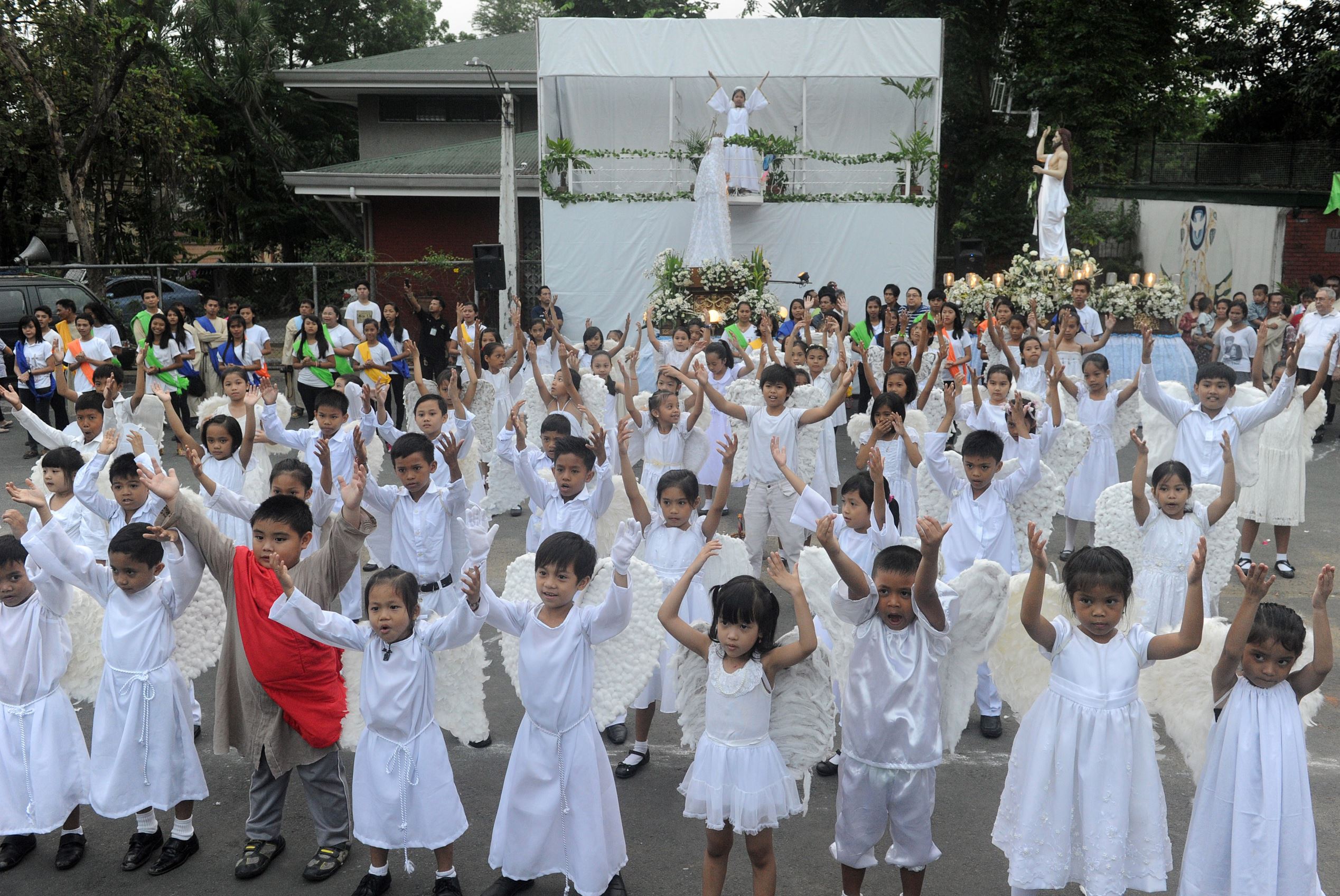 (Pictured) School children dressed as angels dance as they take part in a religious procession outside a Catholic church in Manila, Philippines.