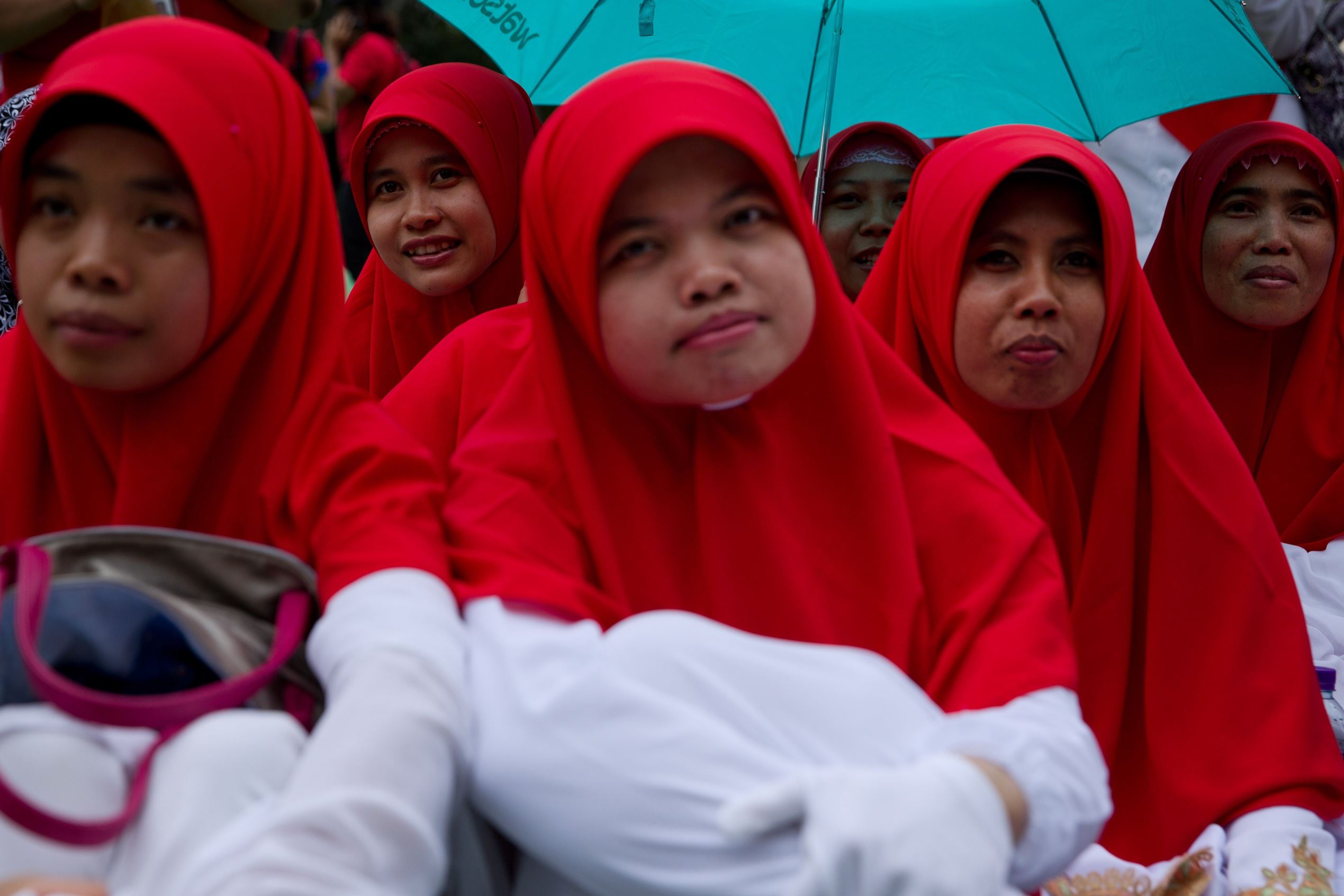 Migrant workers from Indonesia listen to a speech during a May Day protest.