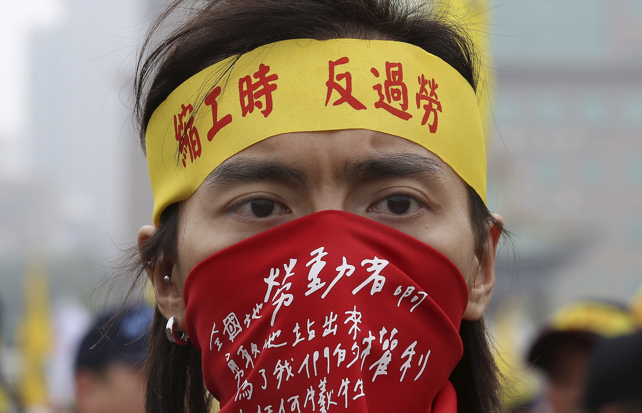 A demonstrator takes part in the annual Labour Day protest in front of Presidential Office in Taipei, Taiwan, May 1, 2015. Thousands of people marched to demand higher wages and labour rights, according to local media. The head banner reads, "shorten working hours; no overfatigue."