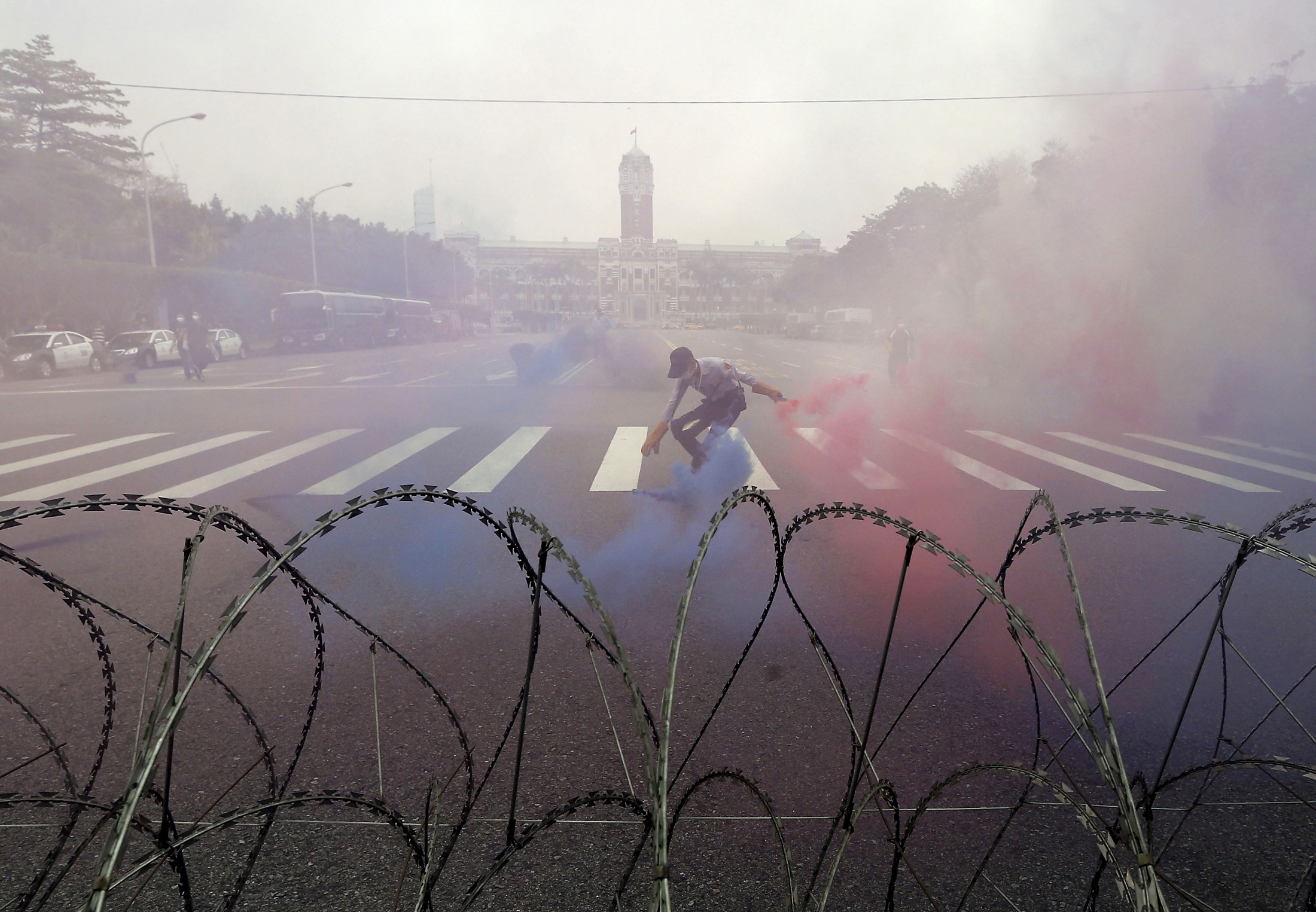 A police officer picks up smoke grenades during the annual Labour Day protest in front of Presidential Office in Taipei, Taiwan, May 1, 2015. Thousands of people marched to demand higher wages and labour rights, according to local media. The head banner reads, "shorten working hours; no overfatigue."