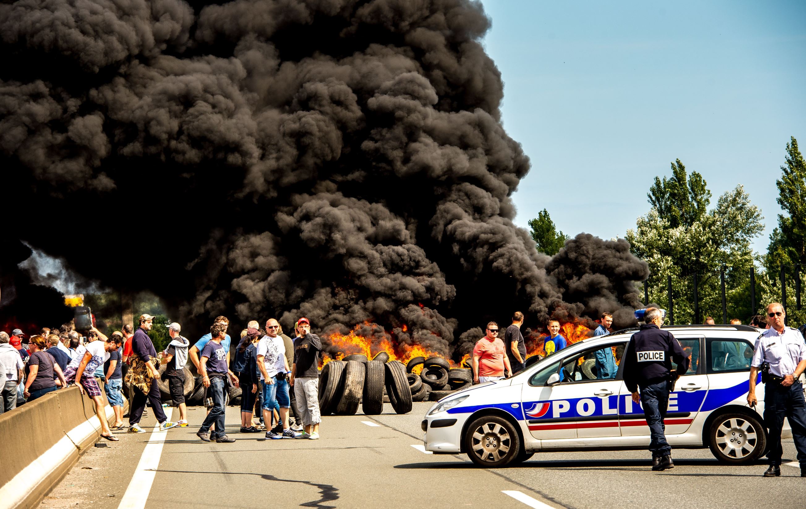 Striking employees of the My Ferry Link company block the access to the harbor after setting tires on fire on July 31 in Calais following the failure of negotiations with French government concerning job cuts.