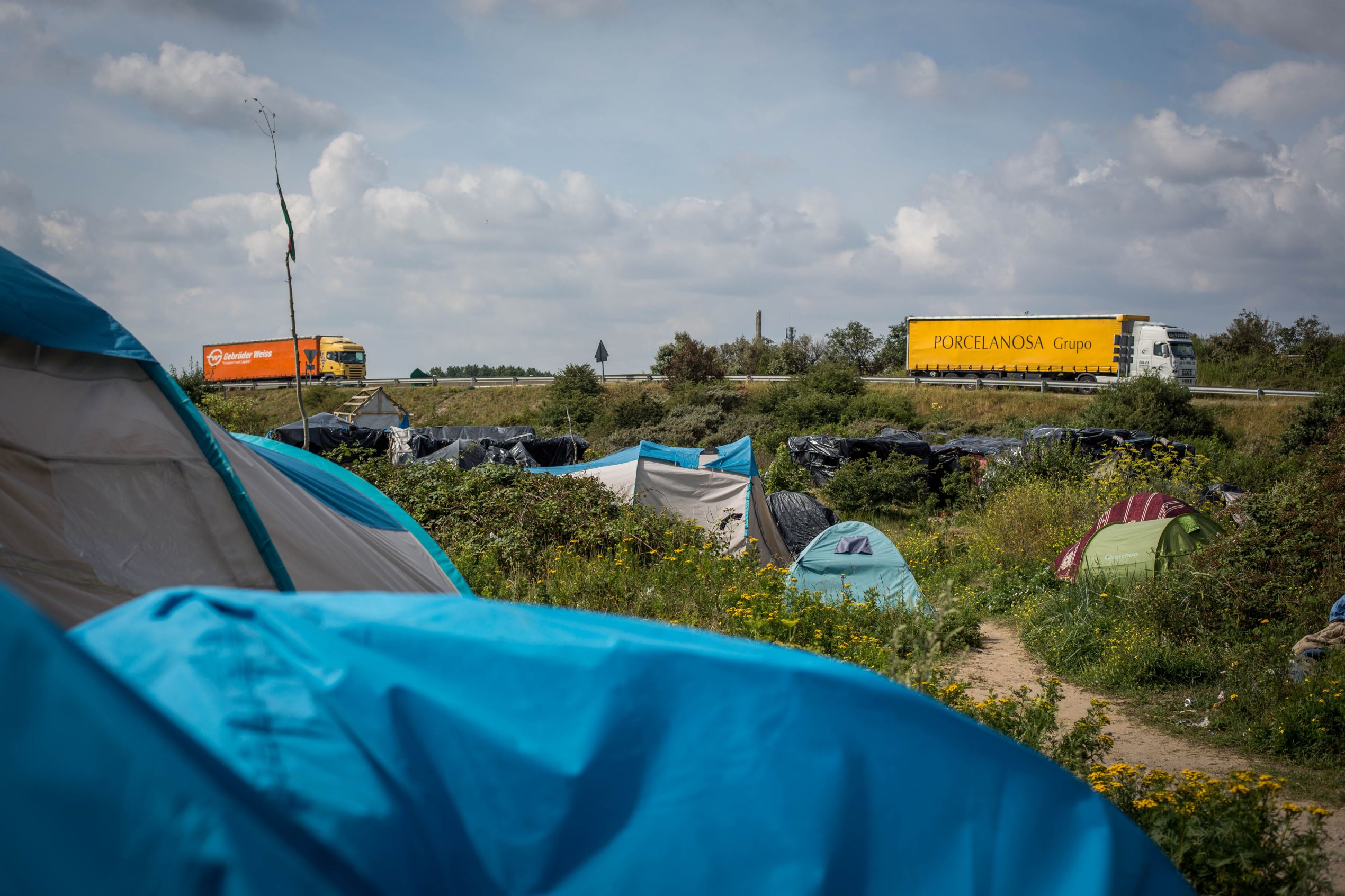 Trucks are seen driving down a road beyond tents in a makeshift camp near the port of Calais on July 31.