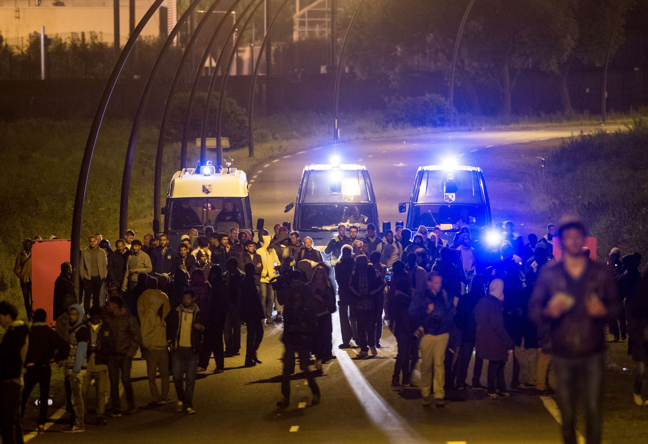 French gendarmes driving vans escort migrants out of the vicinity of the Eurotunnel terminal in Coquelles on July 31 in Calais, France.