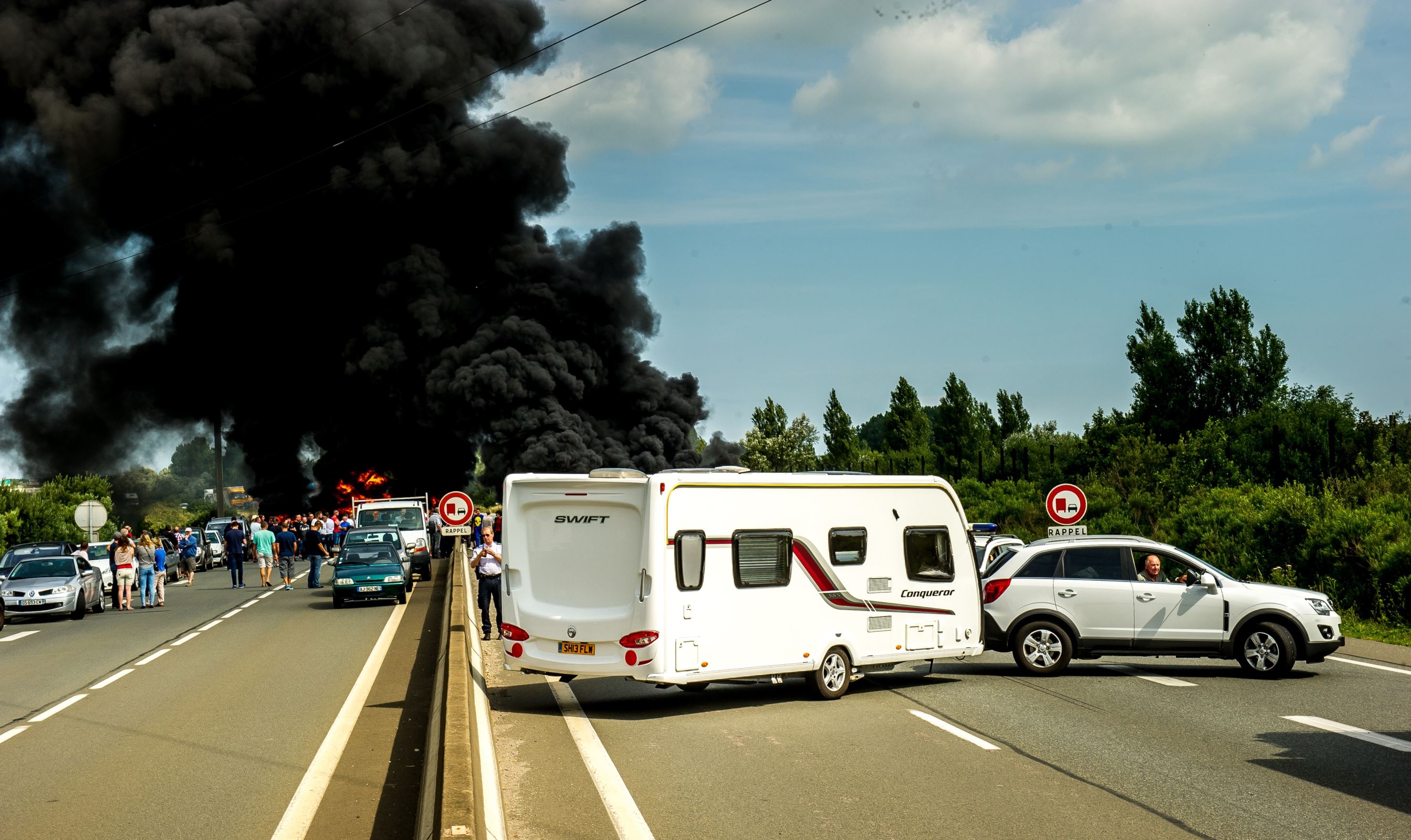 A motorist attempts a U-turn as striking employees of the My Ferry Link company block the access to the harbor on July 31.