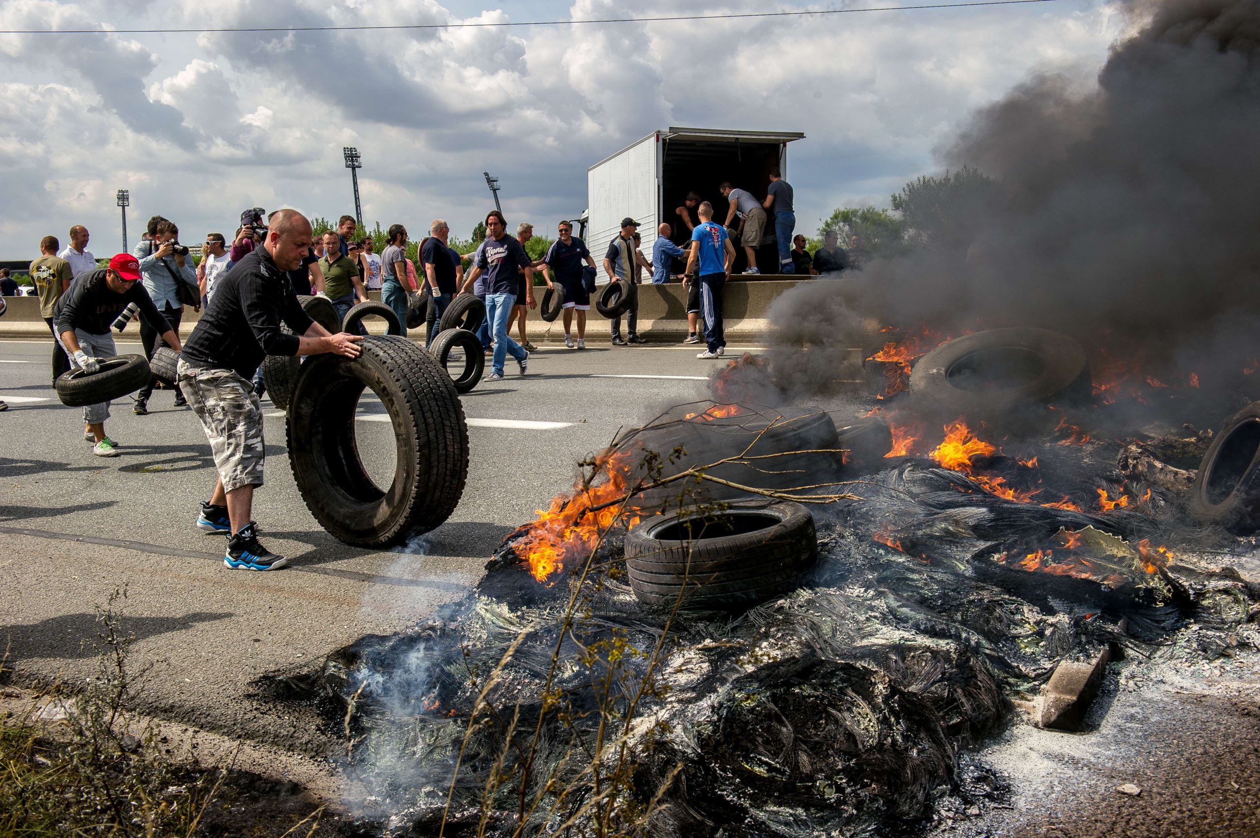 Striking employees of the My Ferry Link company block the access to the harbor with burning tires on July 31.