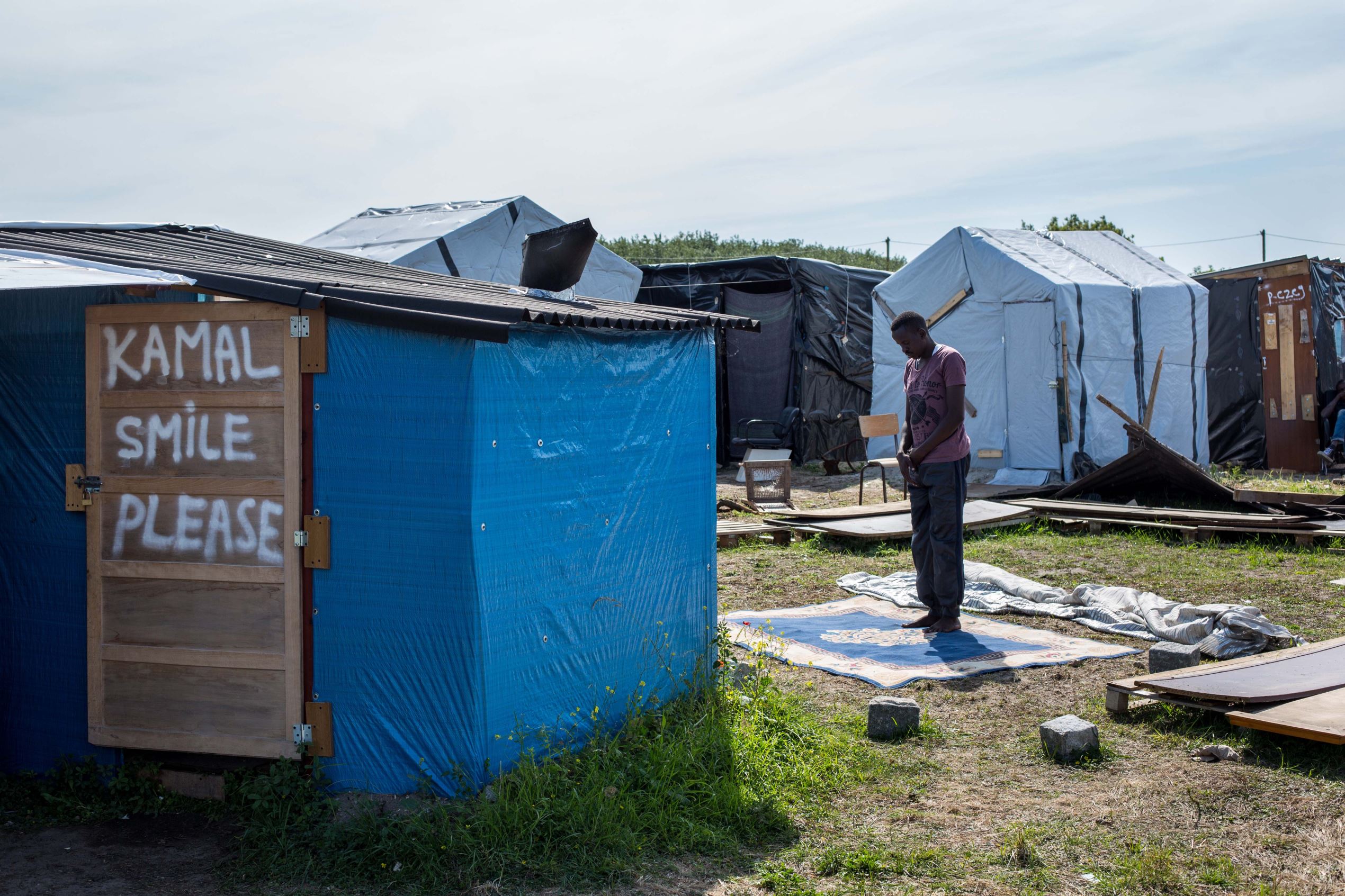 A man prays in a makeshift camp near the port of Calais on Aug. 1.