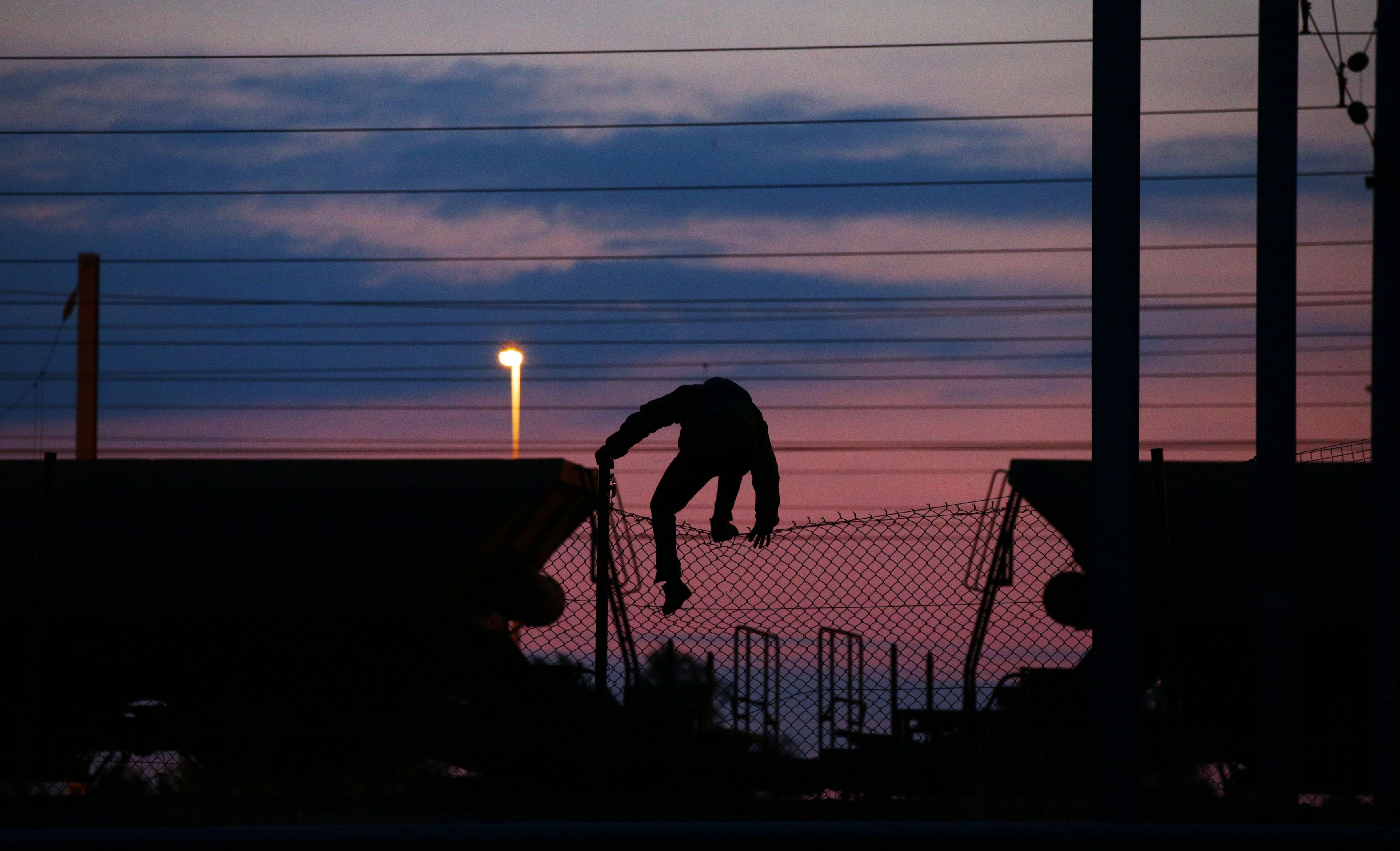 A migrant climbs over a fence on to the tracks near the Eurotunnel site at Coquelles in Calais, France on July 31.