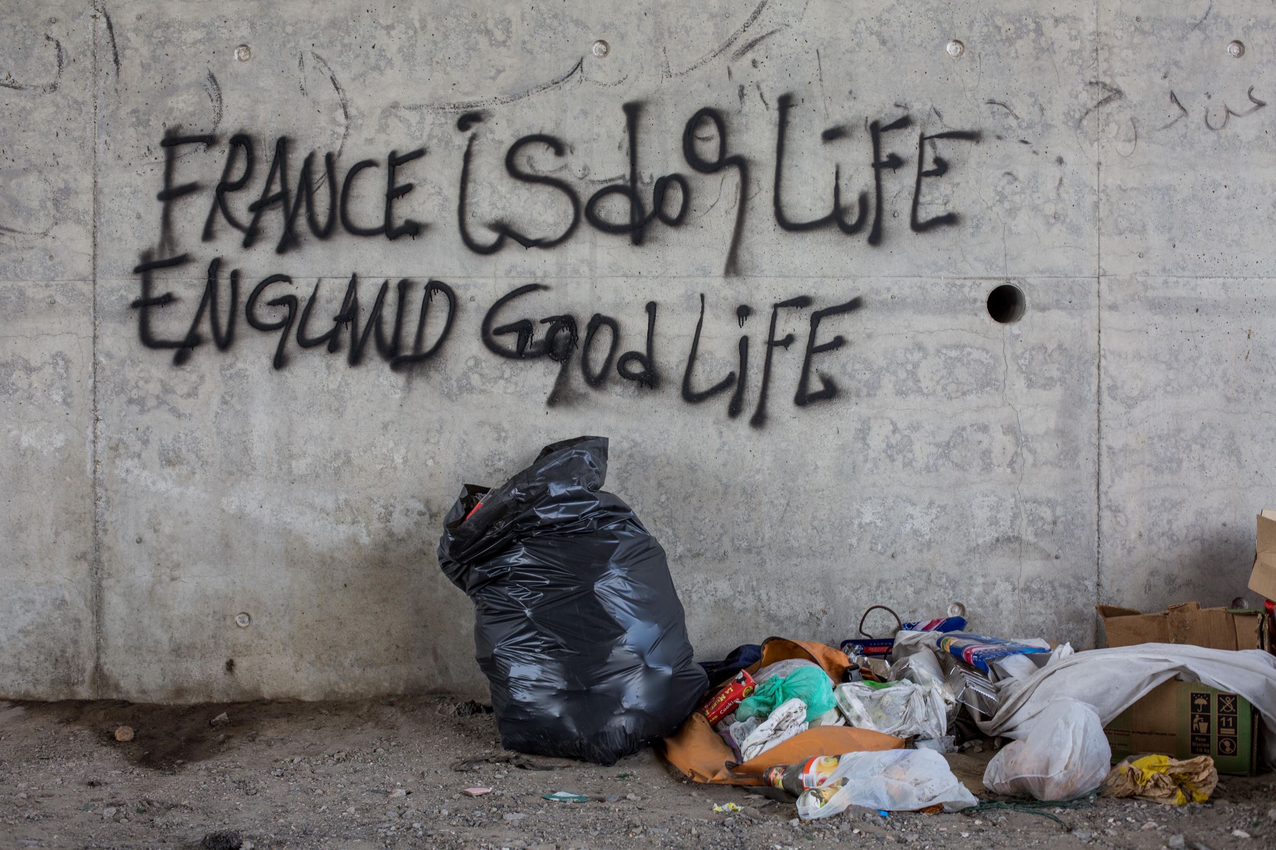 Graffiti reading "France is dog life, England good life" is seen on a wall close to a makeshift camp near the port of Calais on Aug. 1.