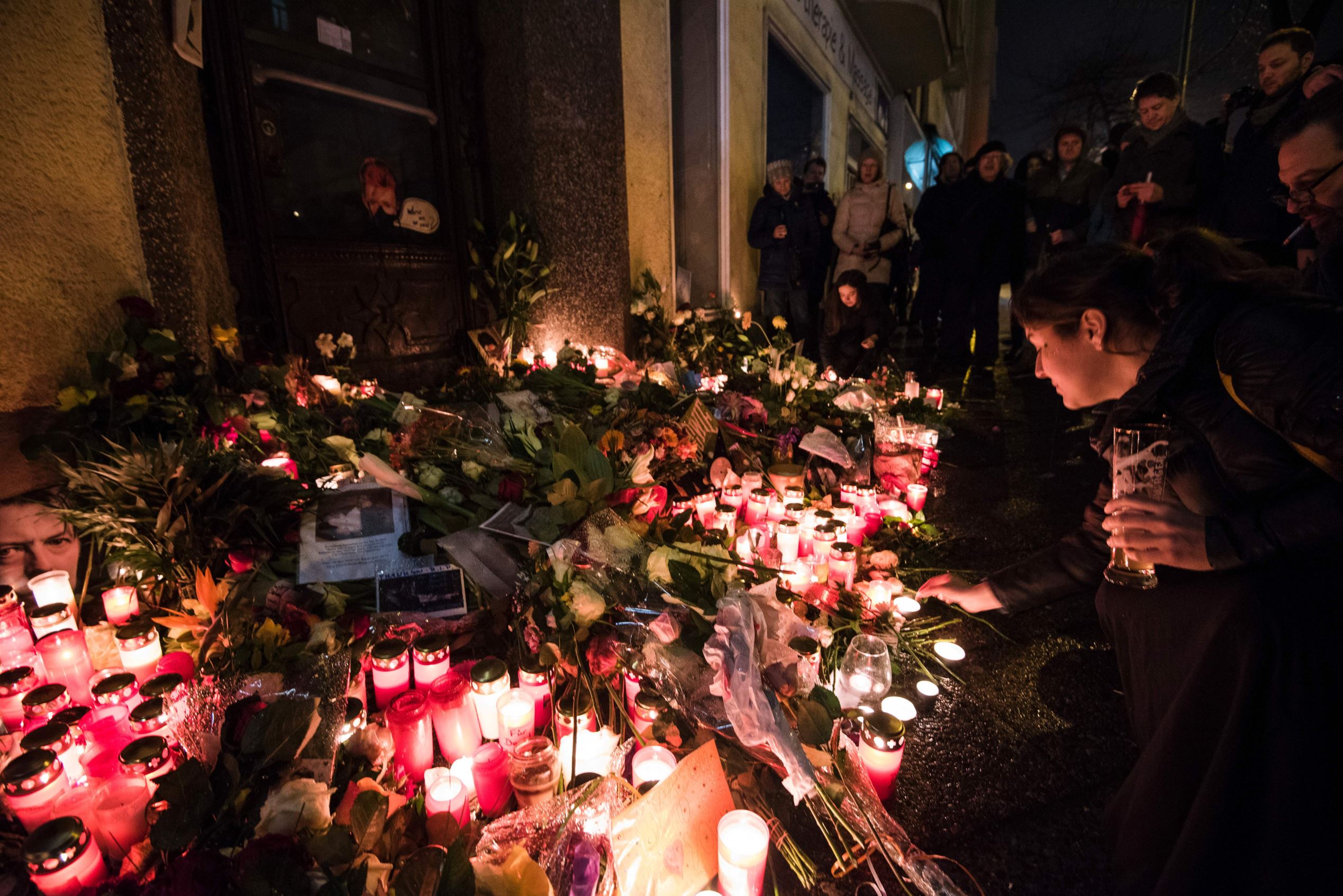 A woman lights a candle during a wake outside Bowie's former home in Berlin's Hauptstrasse 155.