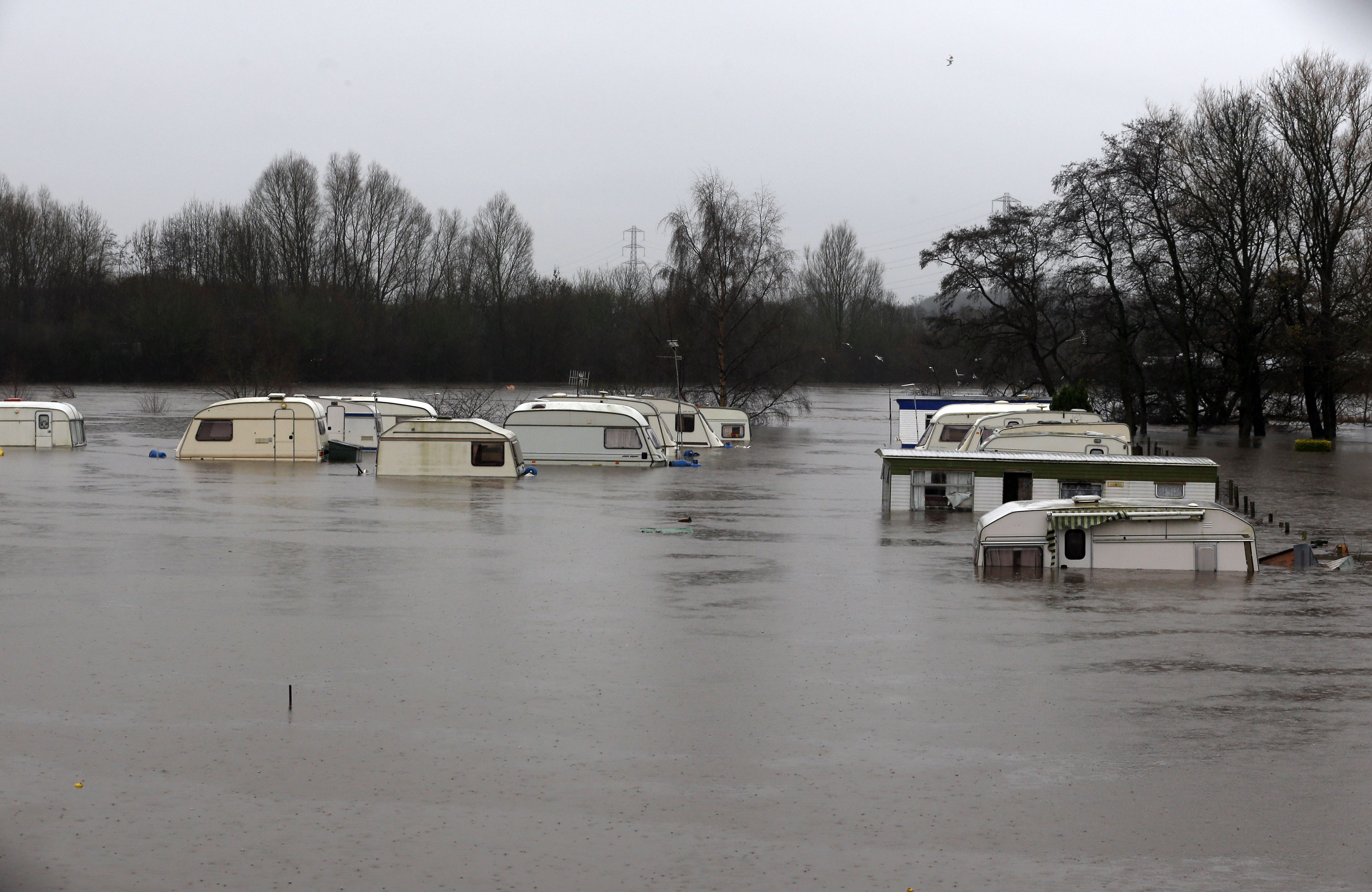 A caravan park inundated by floodwater after the River Nidd burst its banks in Knaresborough, North Yorkshire.