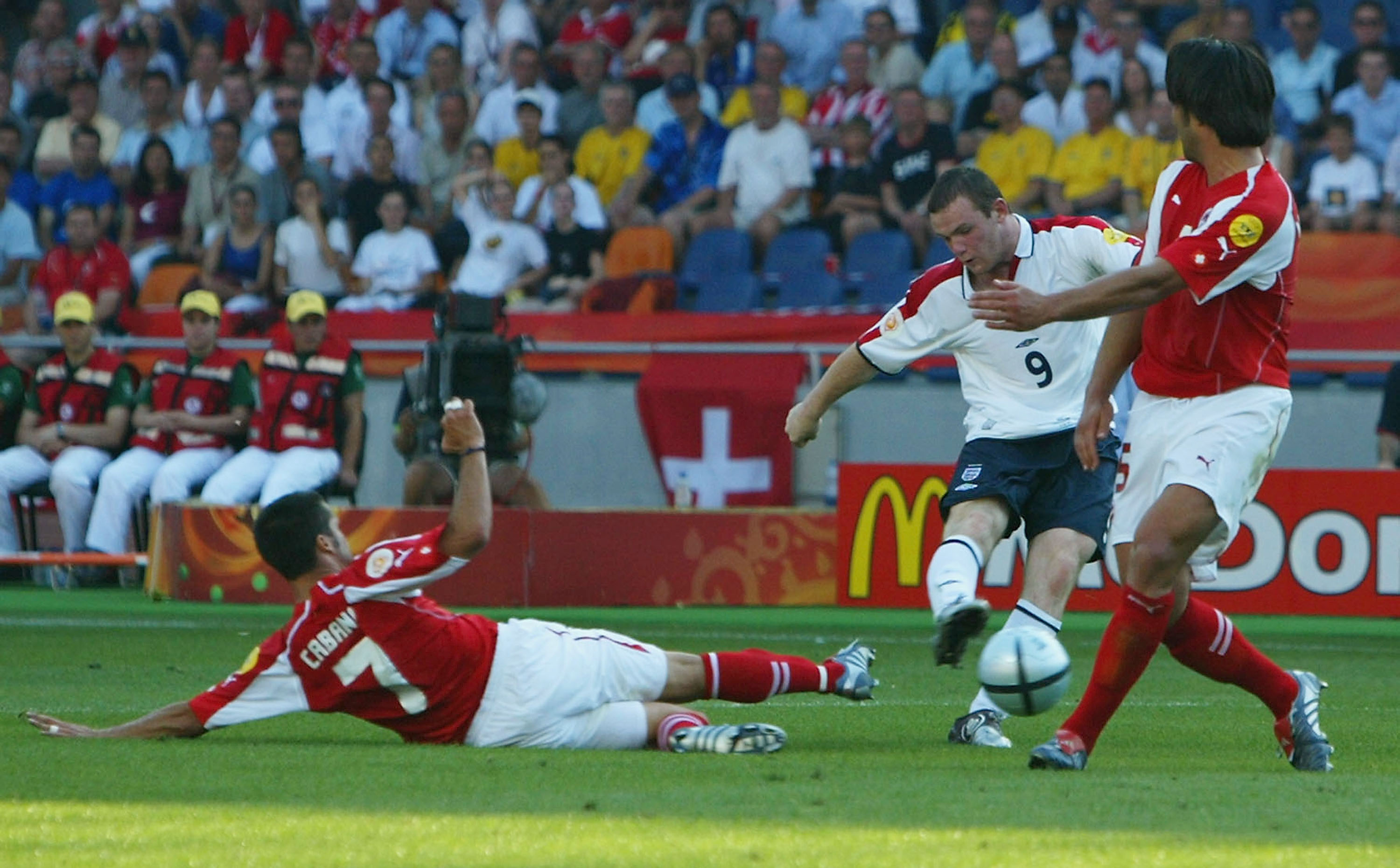 Rooney scores their second goal during the UEFA Euro 2004 match against Switzerland at the Estadio Cidade de Coimbra in Portugal. Final score: England 3-0 Switzerland.