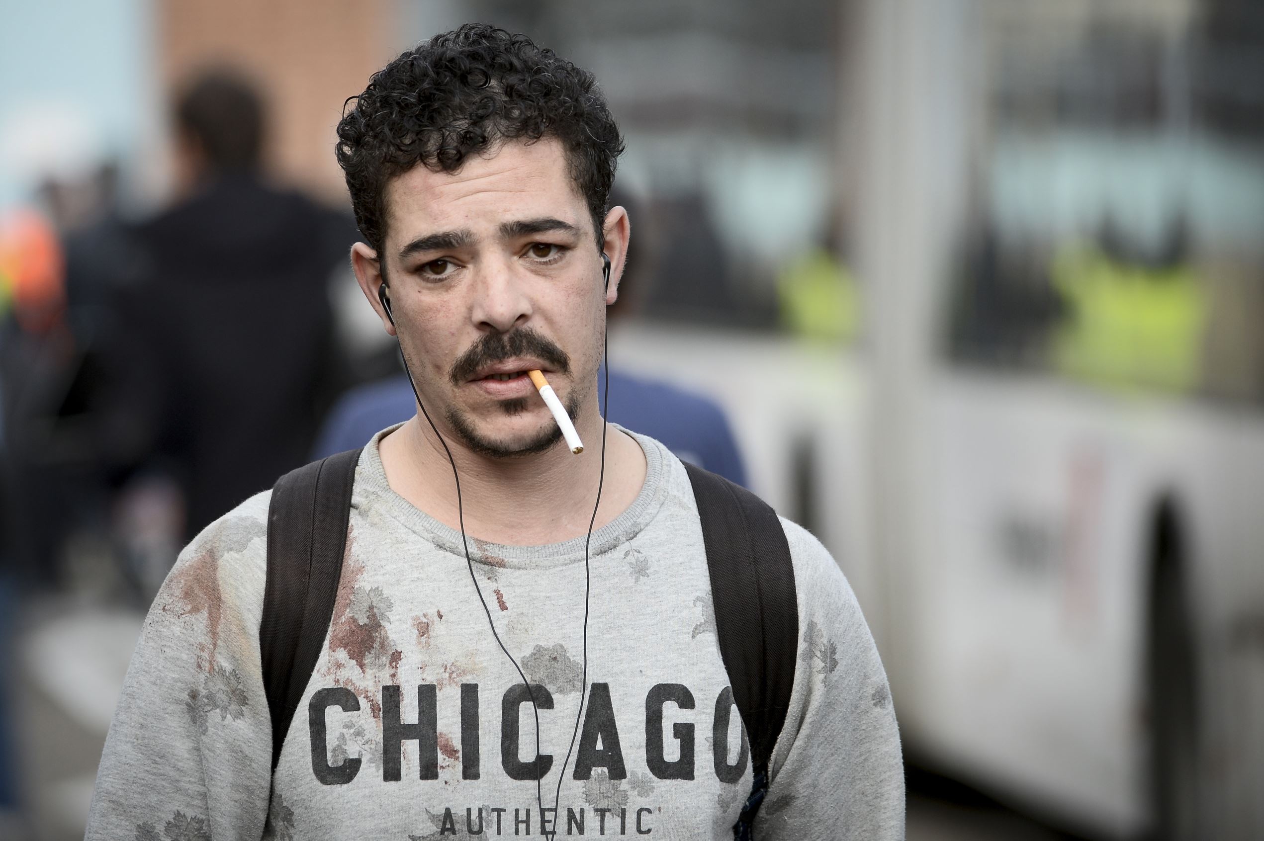 A man with blood stains on his sweater leaves Brussels airport in Zaventem on March 22, 2016 following twin blasts.