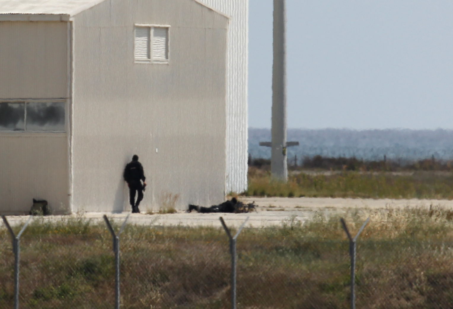 A police sniper keeps watch at Larnaca airport after an EgyptAir Airbus A-320 was hijacked and diverted to Cyprus on March 29, 2016. Everyone on board the hijacked EgyptAir flight diverted to Cyrus has been released except for four crew members and three passengers, Egypt's civil aviation minister said. / AFP / STR (Photo credit should read STR/AFP/Getty Images)