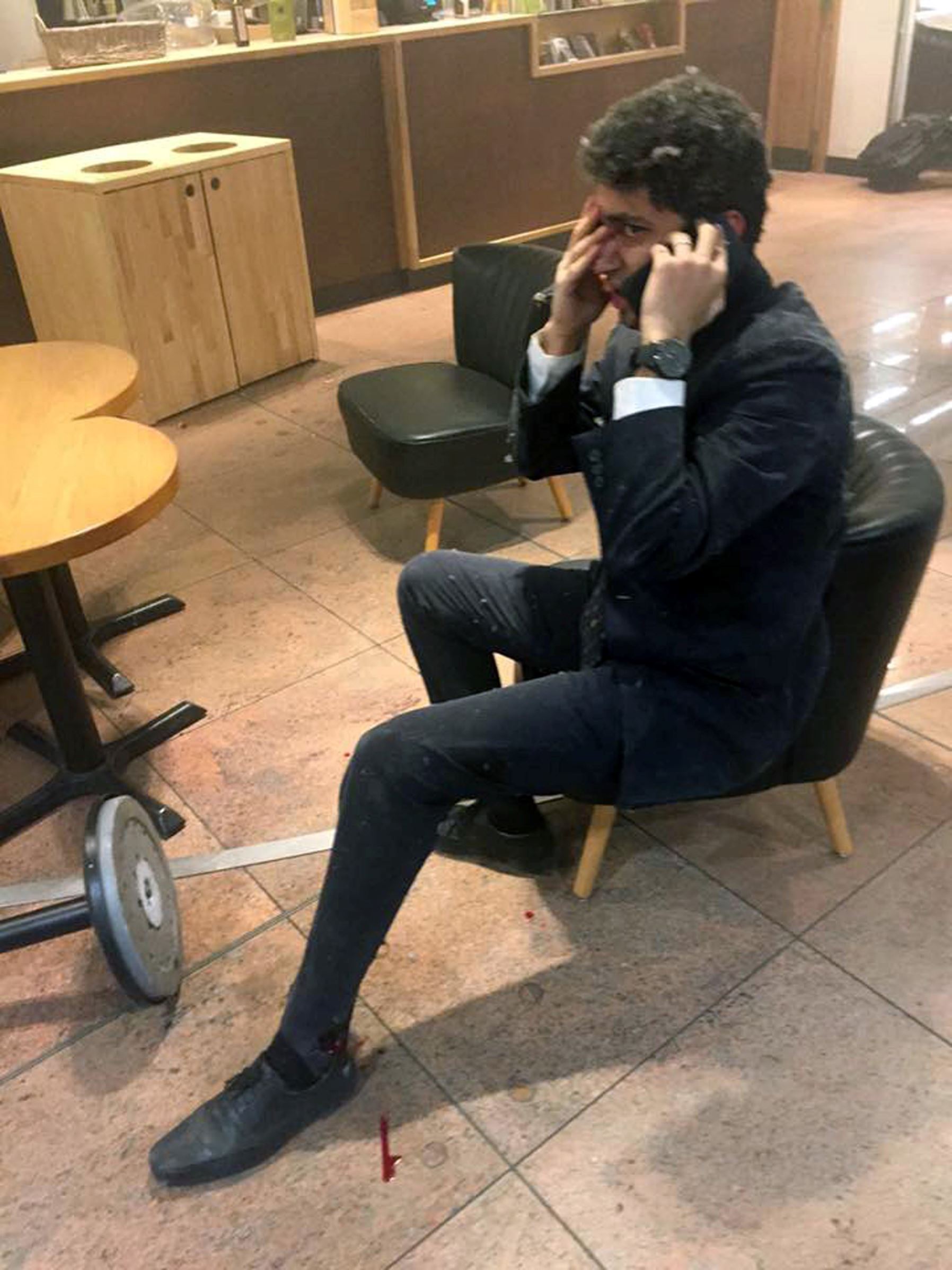 In this photo provided by Georgian Public Broadcaster and photographed by Ketevan Kardava a man speaks on a mobile phone in Brussels Airport in Brussels, Belgium, after explosions were heard Tuesday, March 22, 2016.