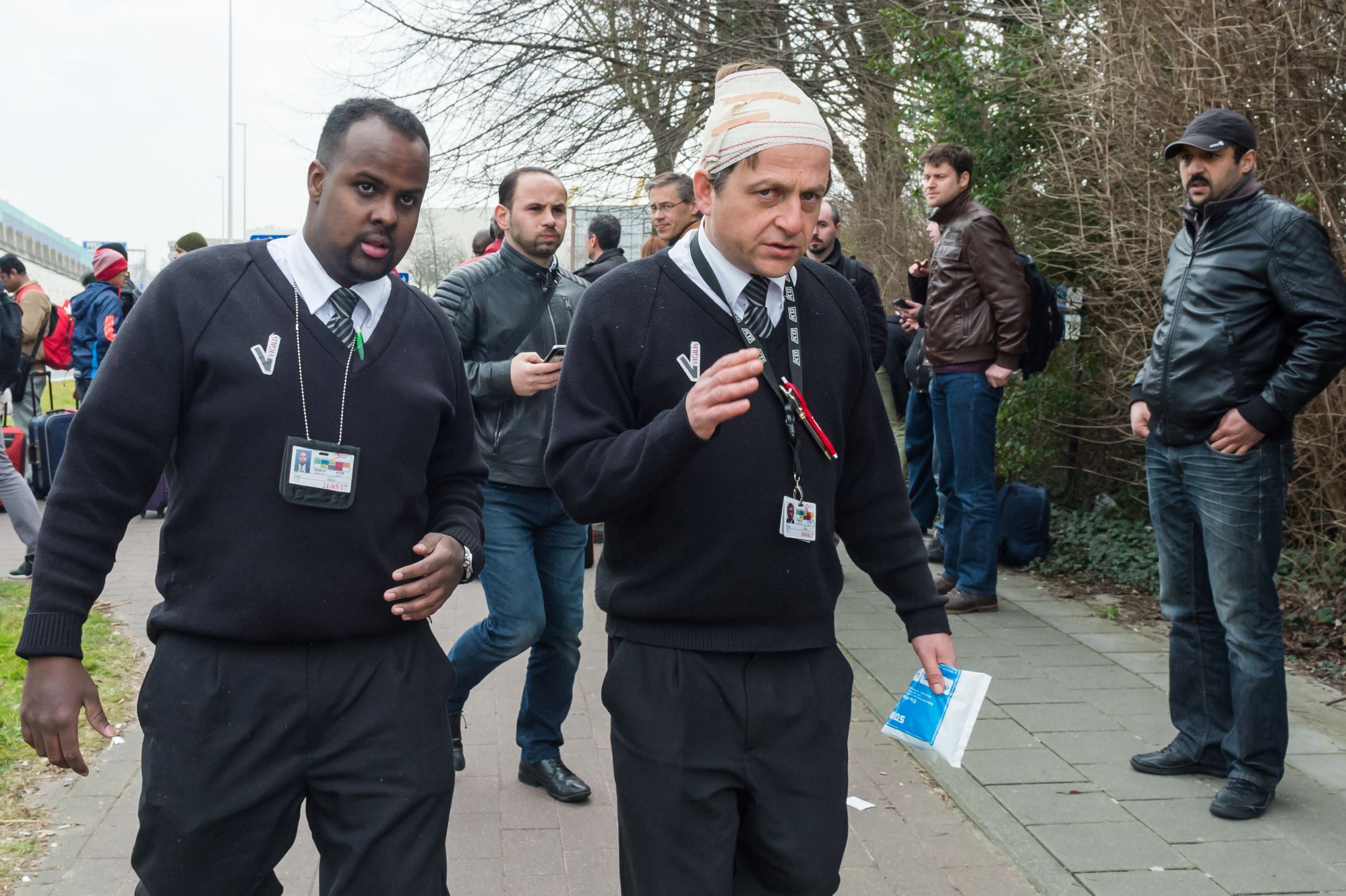 An injured man gestures outsude Brussels airport.