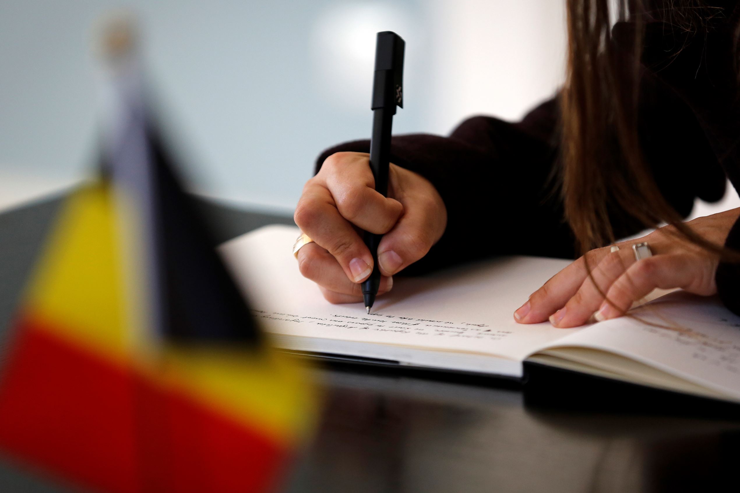A woman signs a condolence book for the victims at the Belgian Embassy in Beijing, China, on March 23.