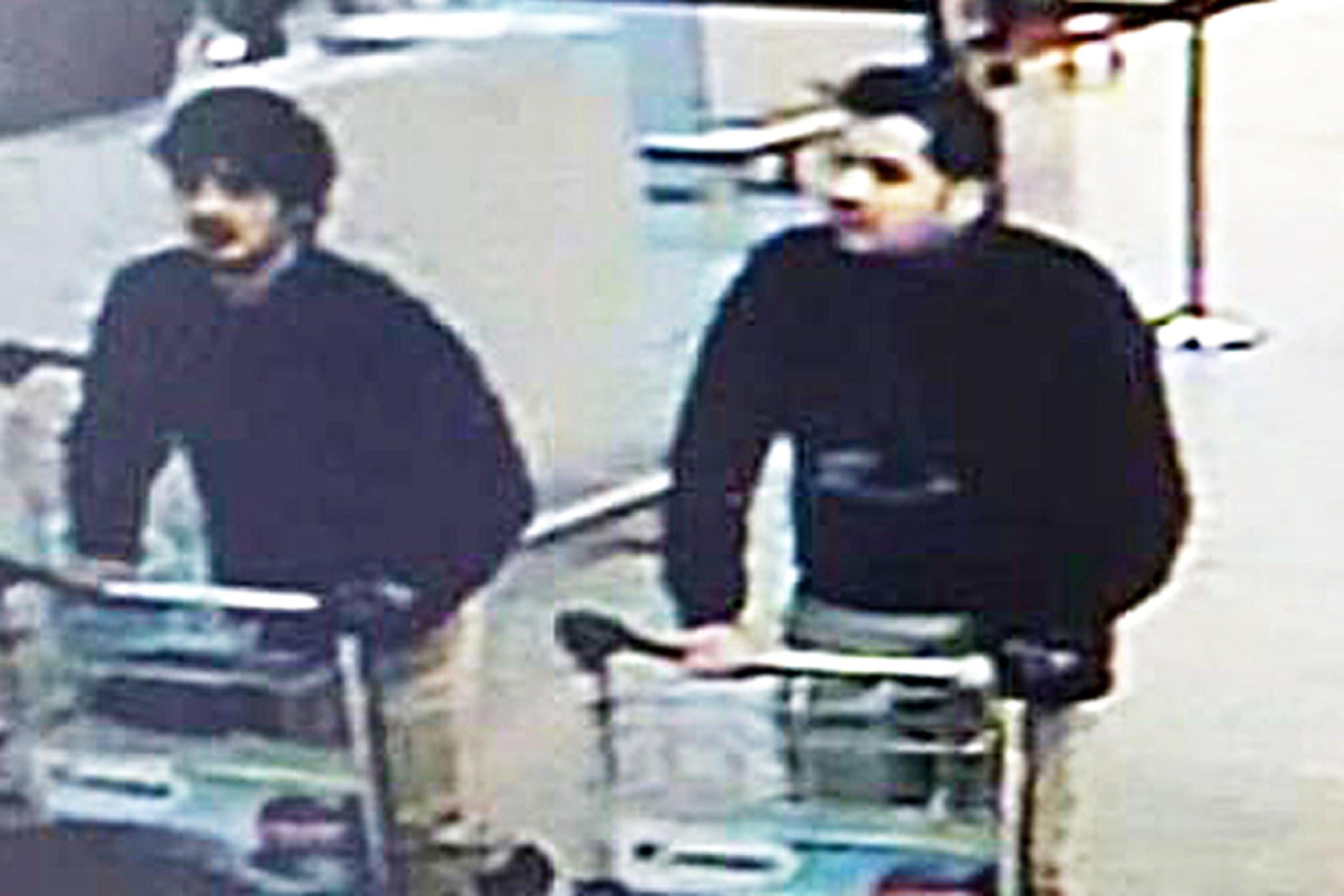 (Pictured) A screen grab, released by the federal police on demand of the federal prosecutor, shows two of the suspects at Zaventem airport.