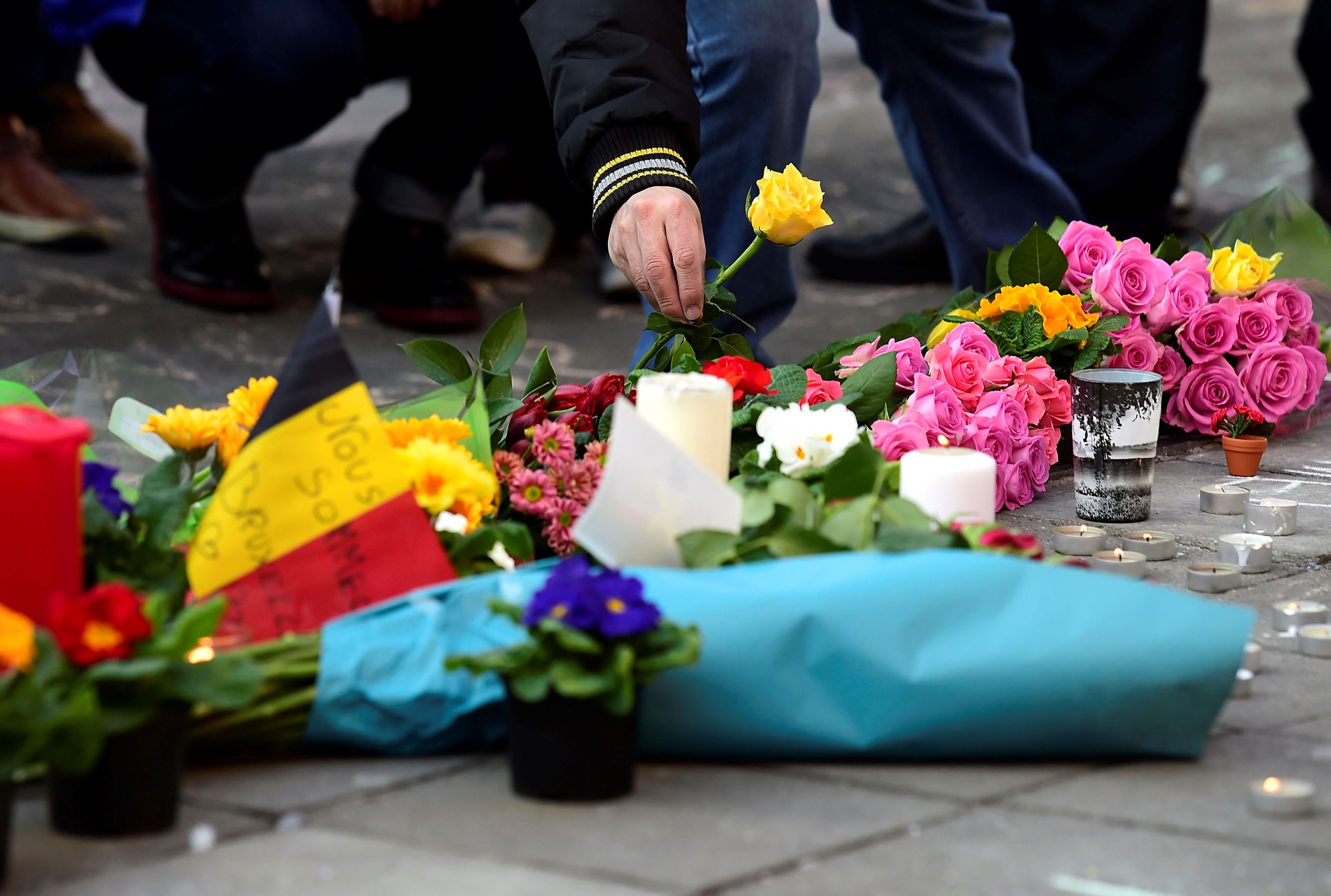 Flowers and candles are placed as a tribute to the victims of the Brussels attack at Beursplein Square in Brussels on March 22.