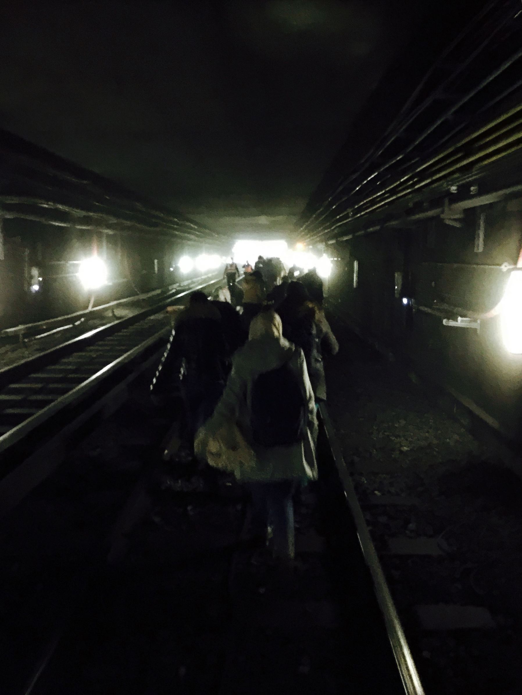 Passengers walk through the metro tunnel during evacuation following the explosion at Maalbeek station.