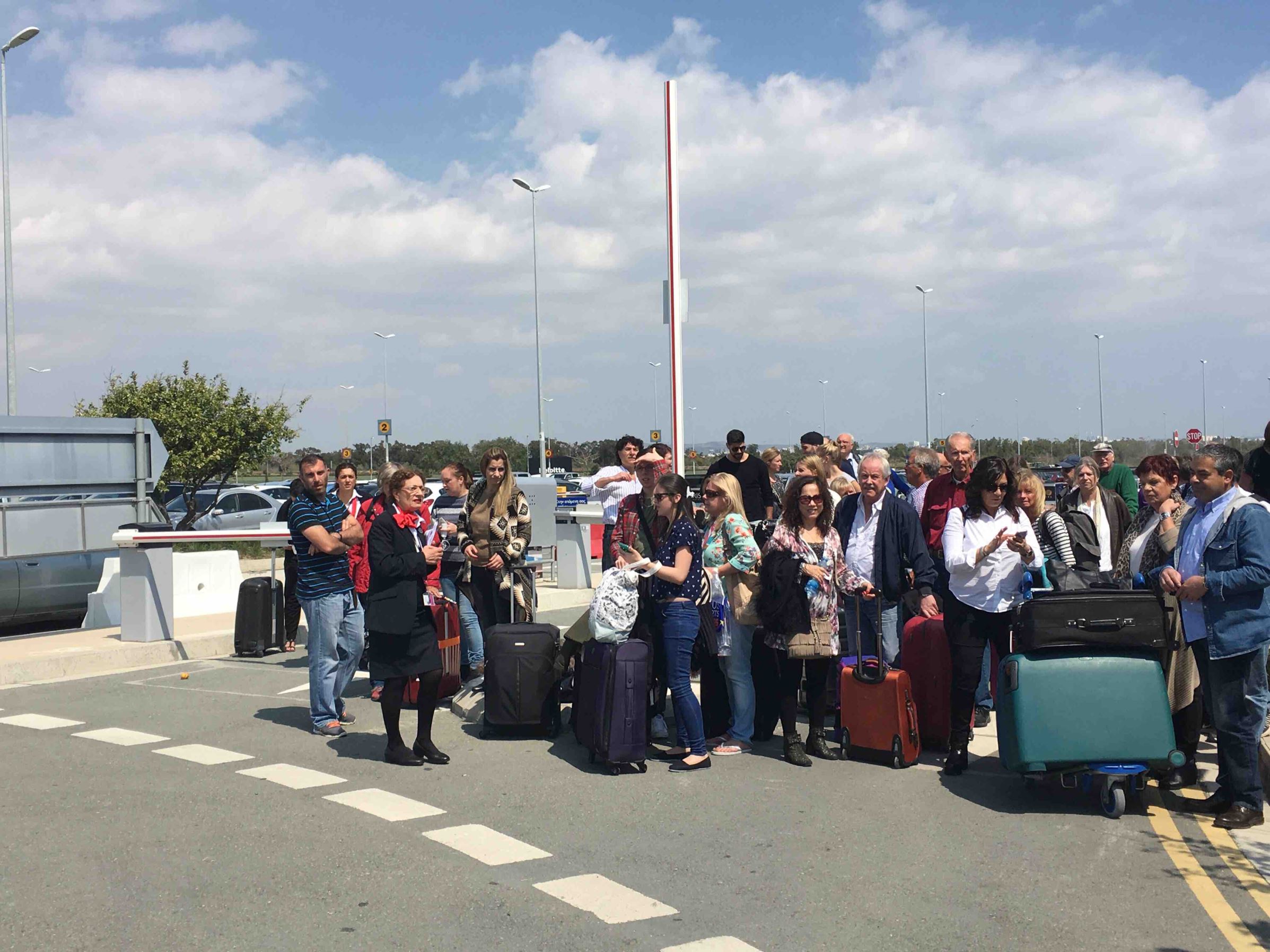 Passengers wait at the airport for a bus to Paphos as the situation on the runway continues.