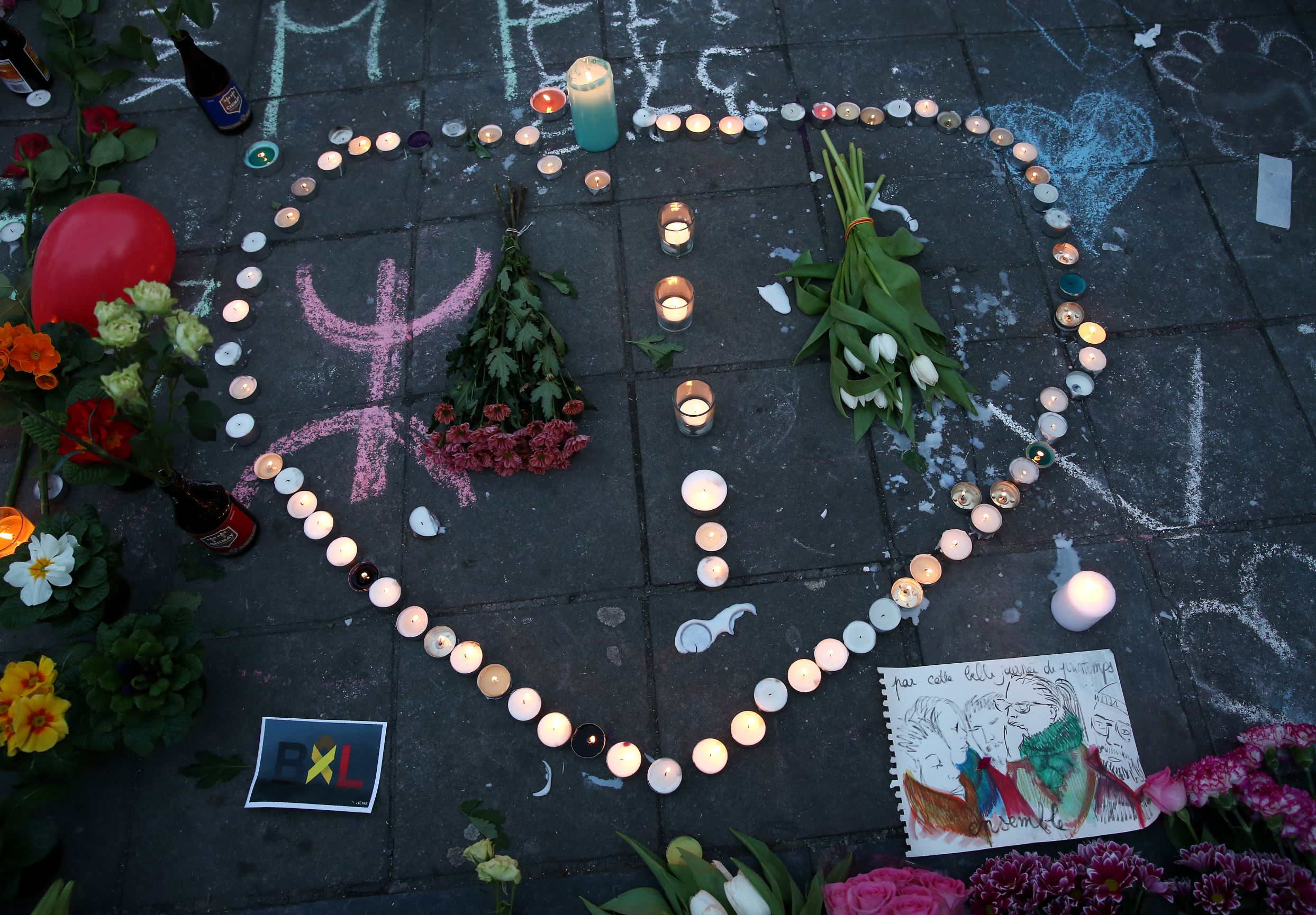 Candles are lit and placed in the shape of a heart at the Place de la Bourse in Brussels, on March 22.