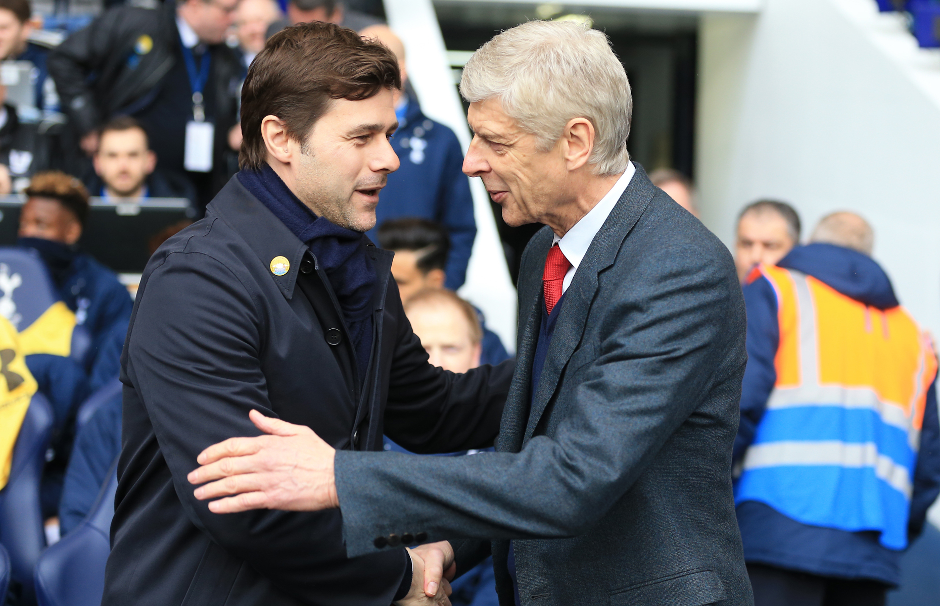 Managers Mauricio Pochettino (left) and Arsene Wenger (right) greet each other warmly ahead of Saturday's crucial clash at White Hart Lane.