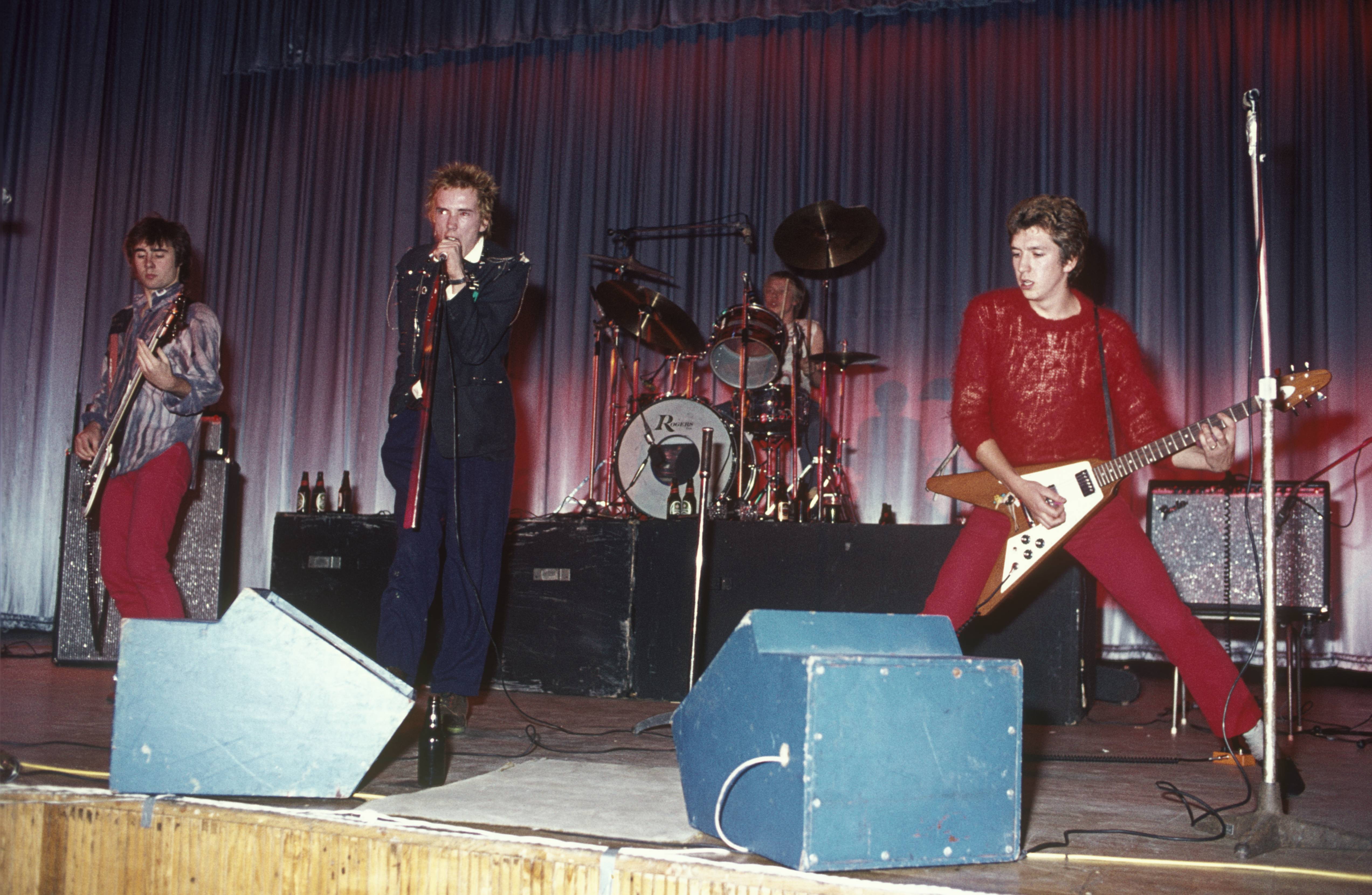 (Pictured) L-R: Glen Matlock, Johnny Rotten (John Lydon), Paul Cook, Steve Jones performing live in England, on Oct. 21, 1976.