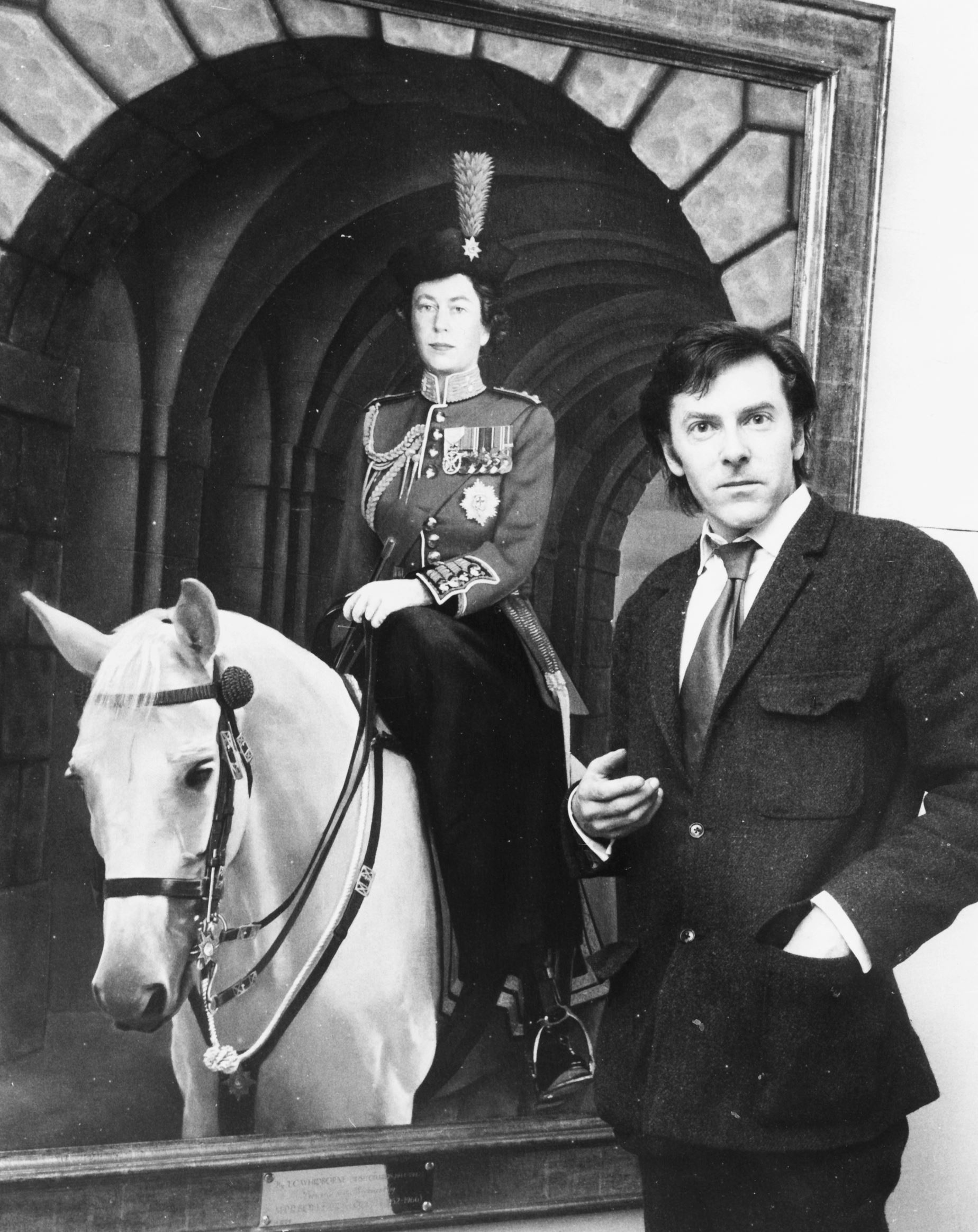 Artist Timothy Whidborne poses next to his portrait of Queen Elizabeth II at Grosvenor House Galleries in London on April 22, 1969.