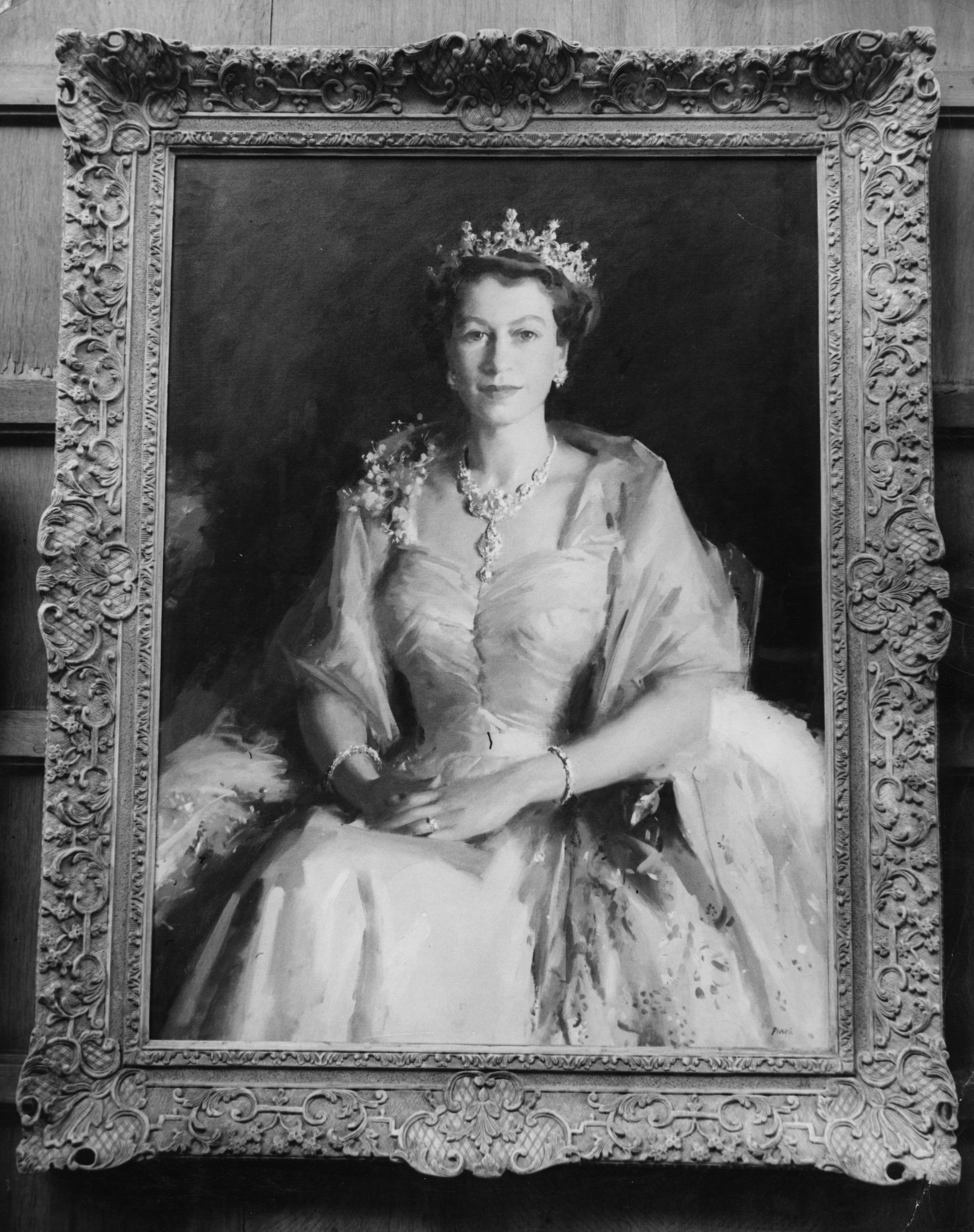 W.A. Dargie's portrait of Queen Elizabeth II in the Royal Society of Portrait Painters' Exhibition at the Royal Institute Galleries in Piccadilly on Nov. 17, 1955.