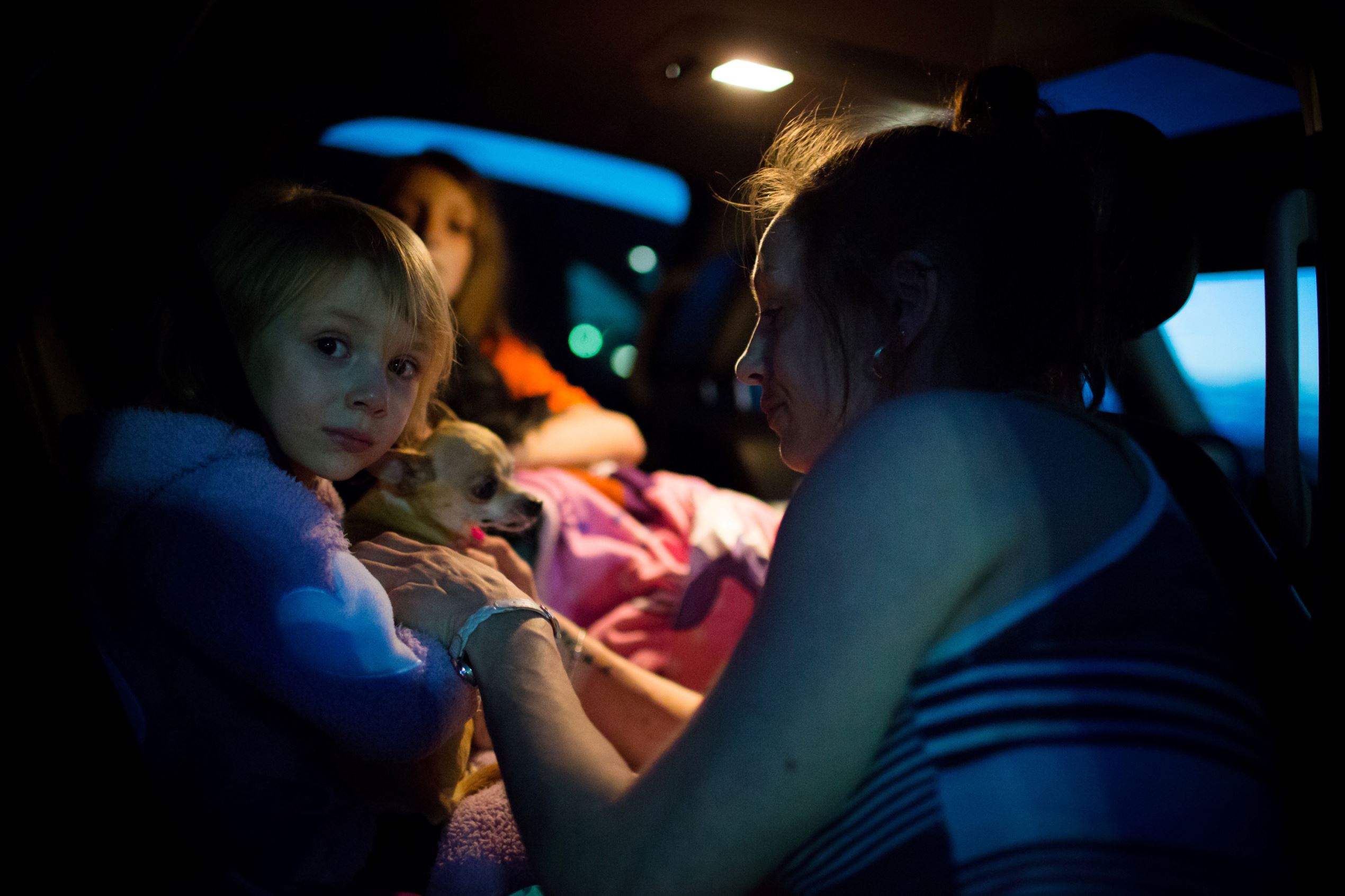 A resident buckles in her daughter as they prepare to leave Conklin, Alberta, for Lac La Biche after evacuating their home in Fort McMurray.
