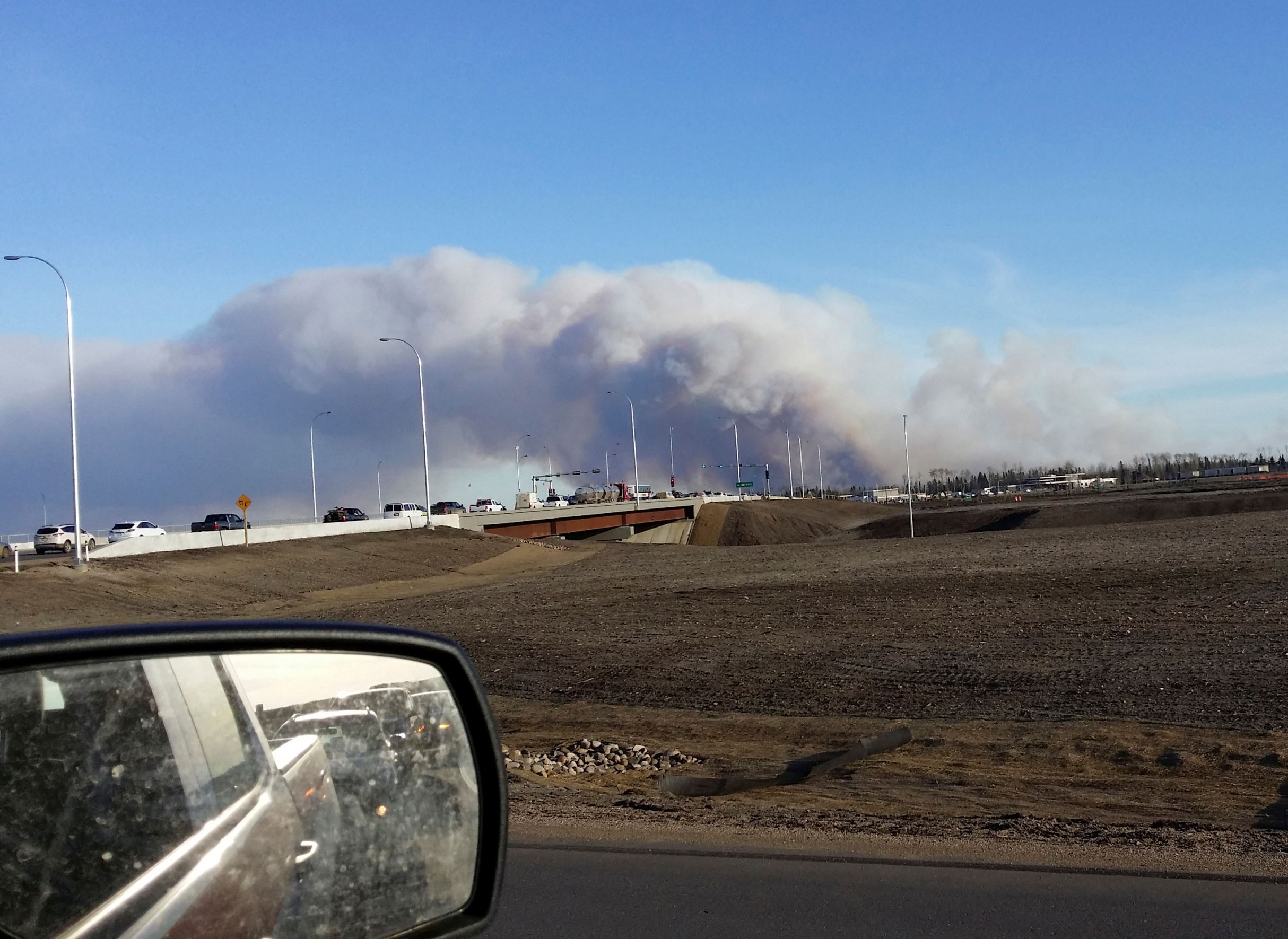Vehicles are seen on highway 63 as they are detoured near wildfire burning near Fort McMurray, Alberta