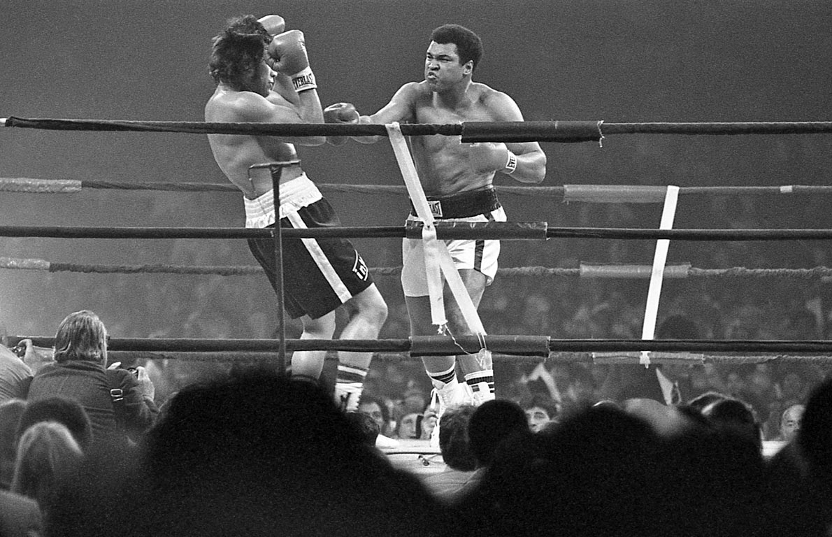 Ali fights Uruguayan Alfredo Evangelista in a Heavyweight Championship bout at the Capital Centre, Landover, Maryland, U.S., May 16, 1977. Ali won the fight by a unanimous decision in round 15 of 15.